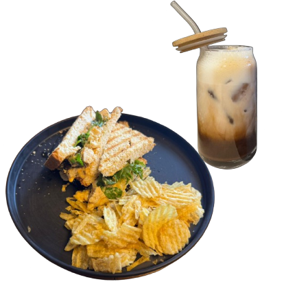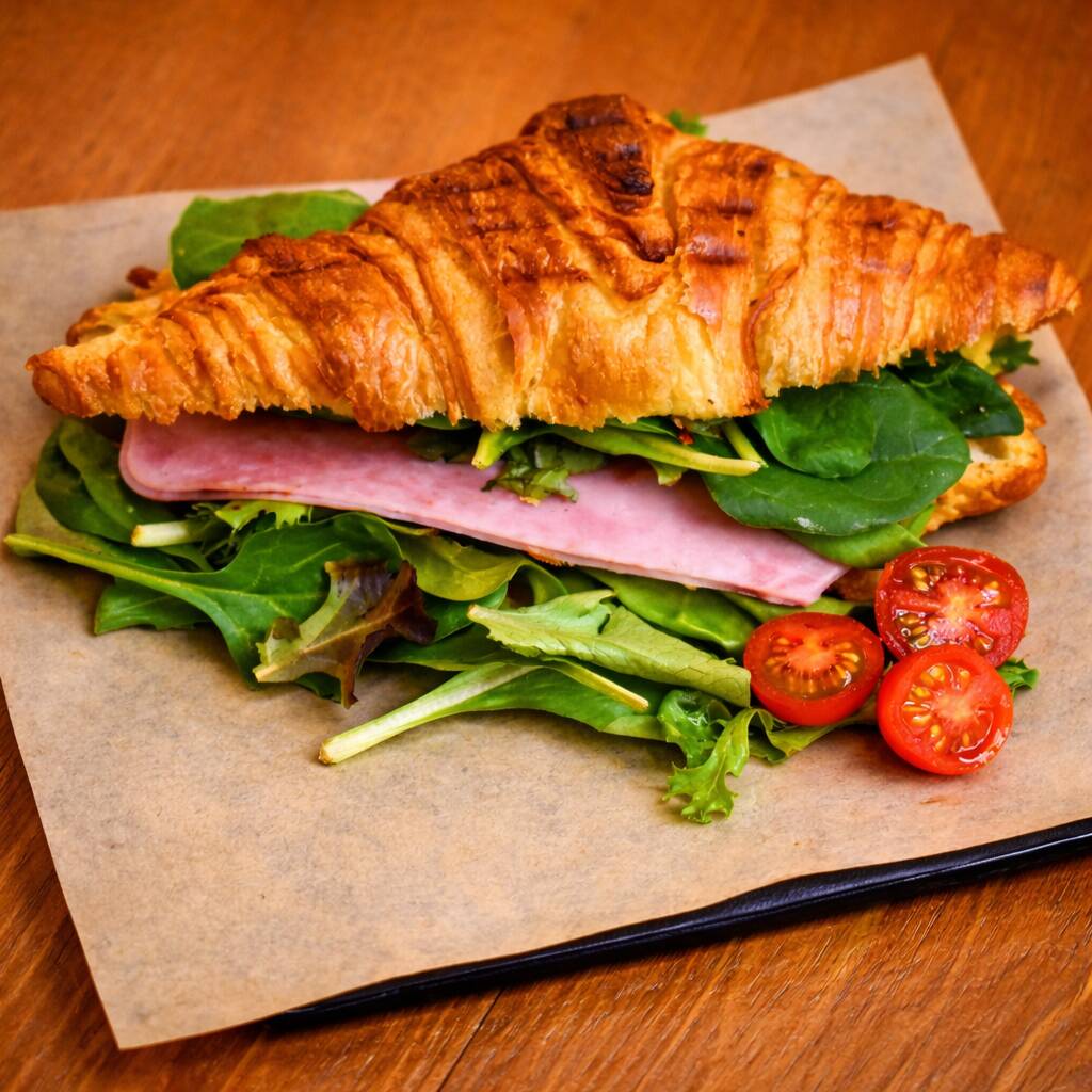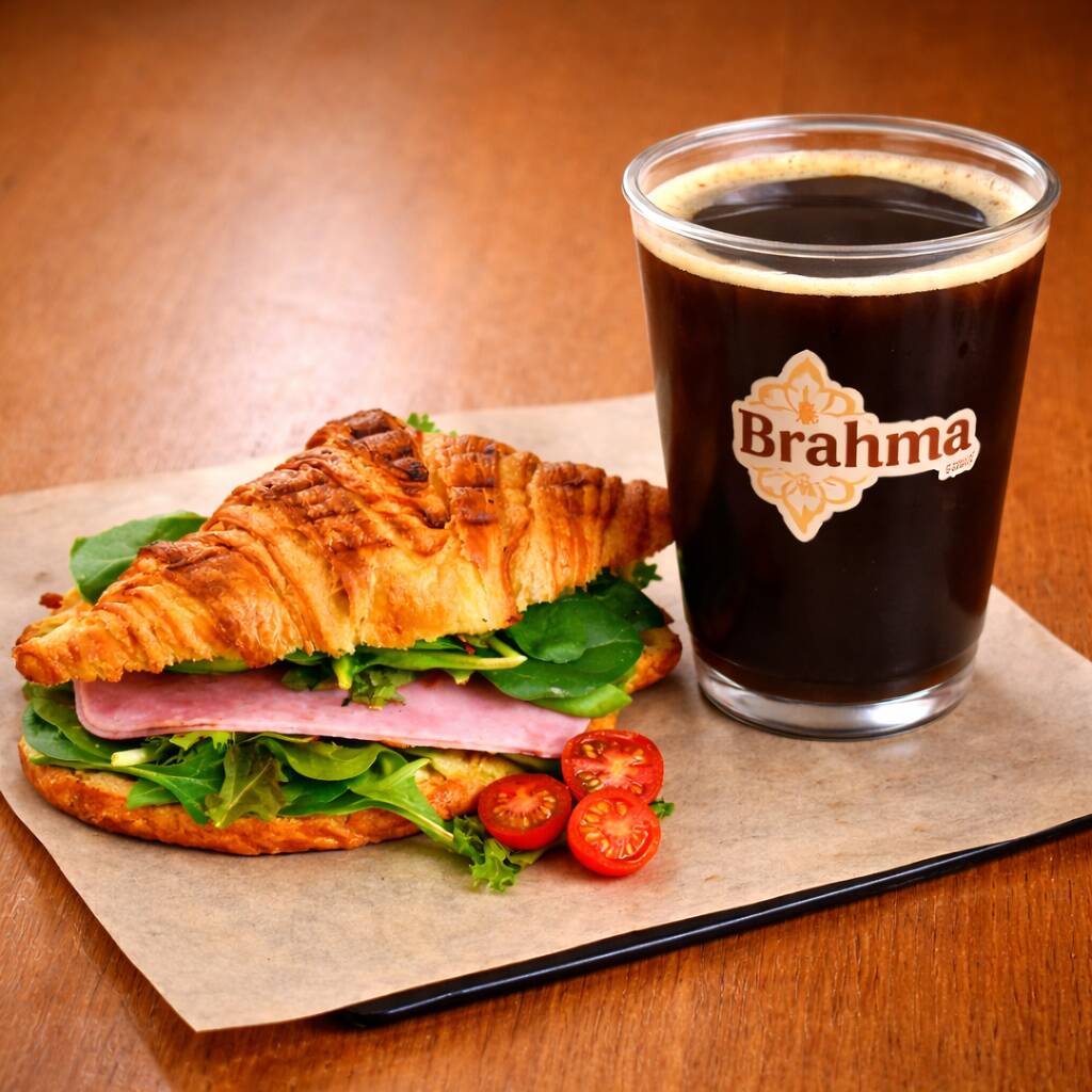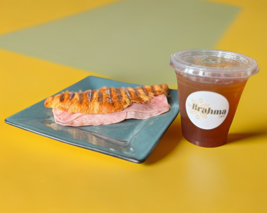 cafe americano a base de un shot de espresso acompañado de un croissant con jamon y queso o huevo a elegir