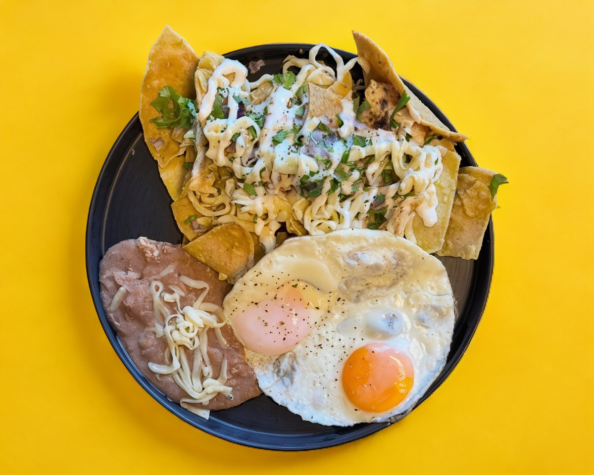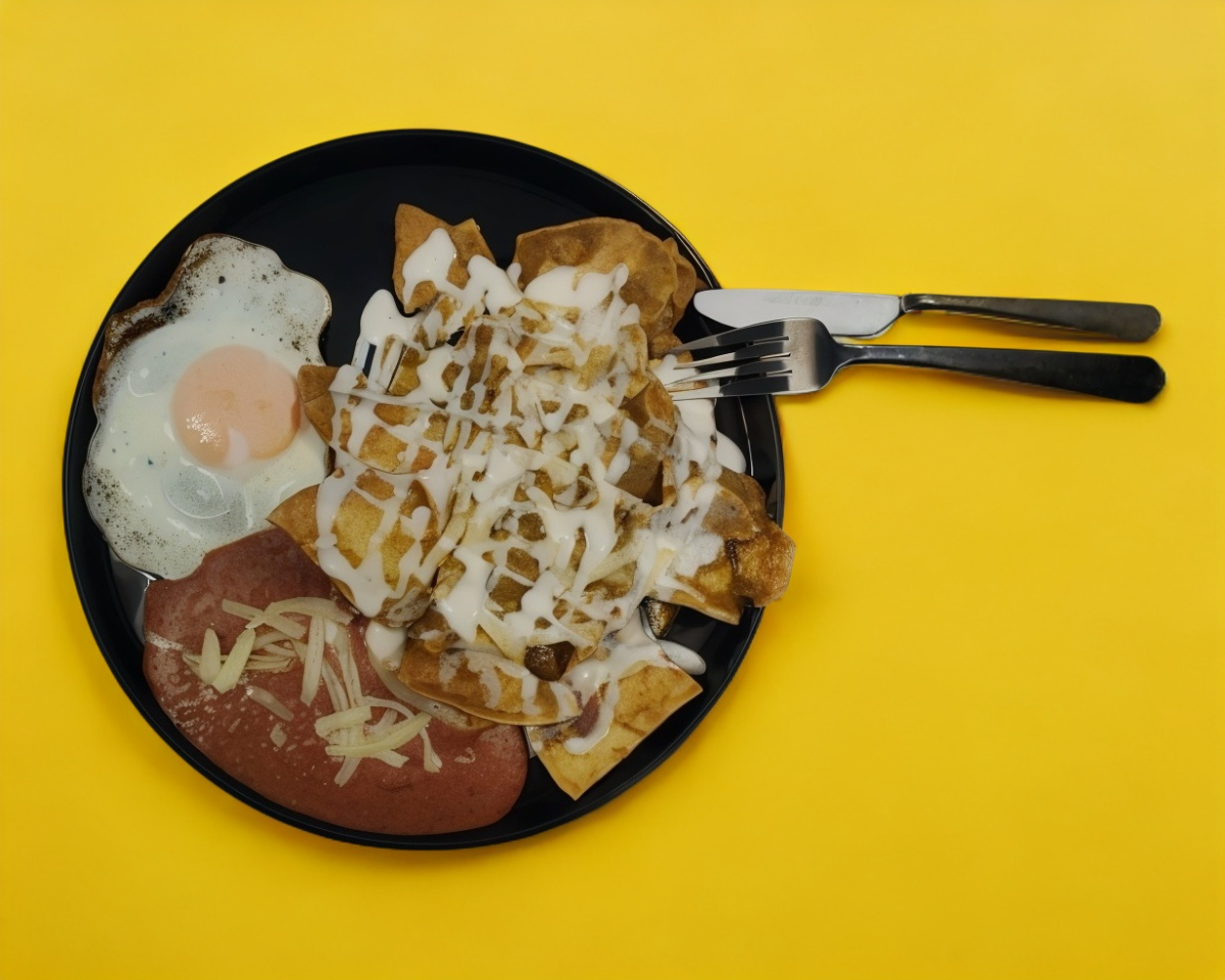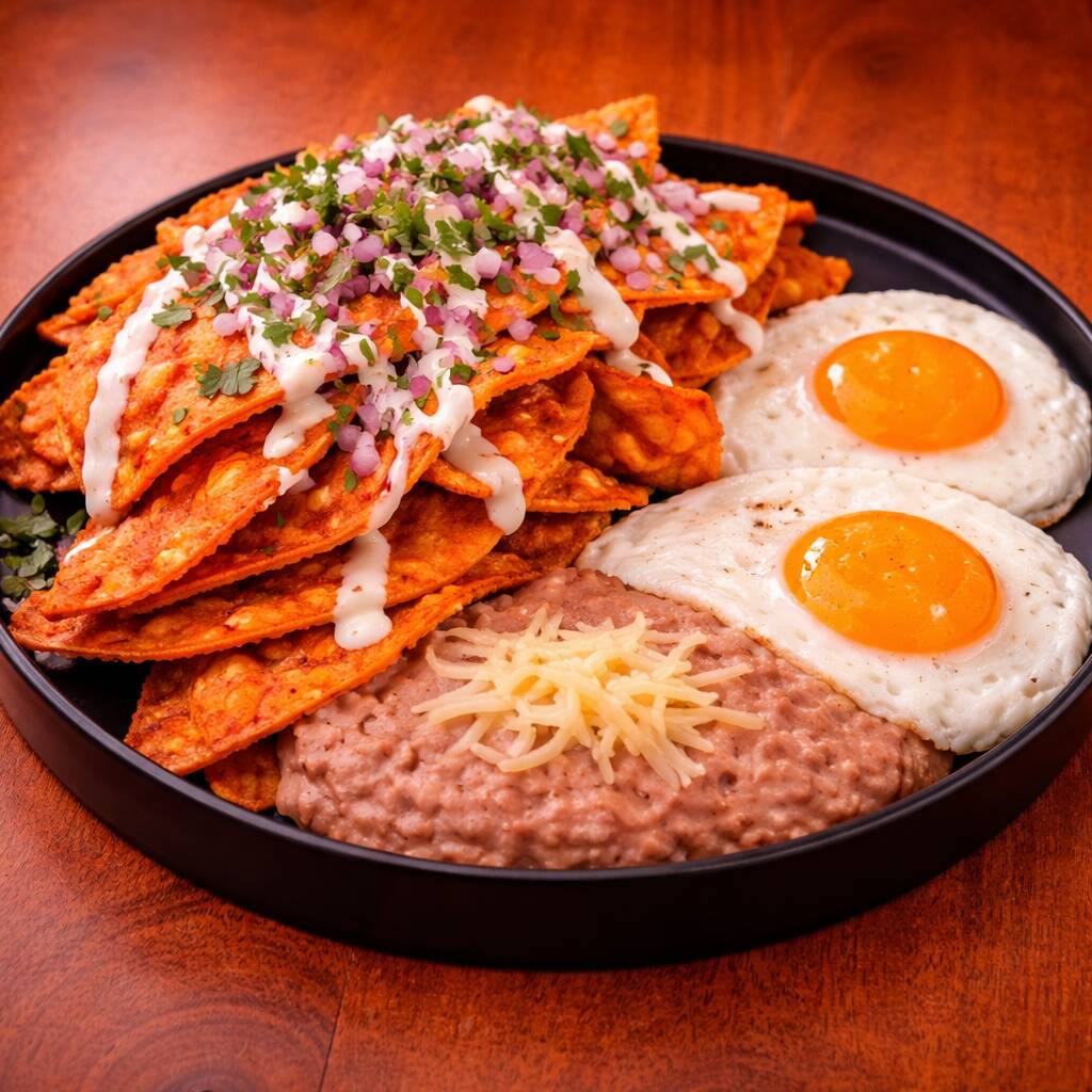 Chilaquiles Rojos: Ricos totopos bañados en salsa roja, con queso. Cilantro, cebolla y acompañados de frijoles refritos de la casa.