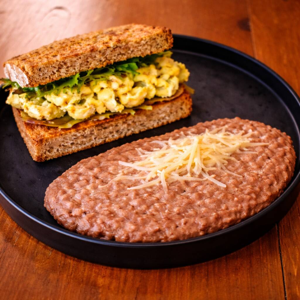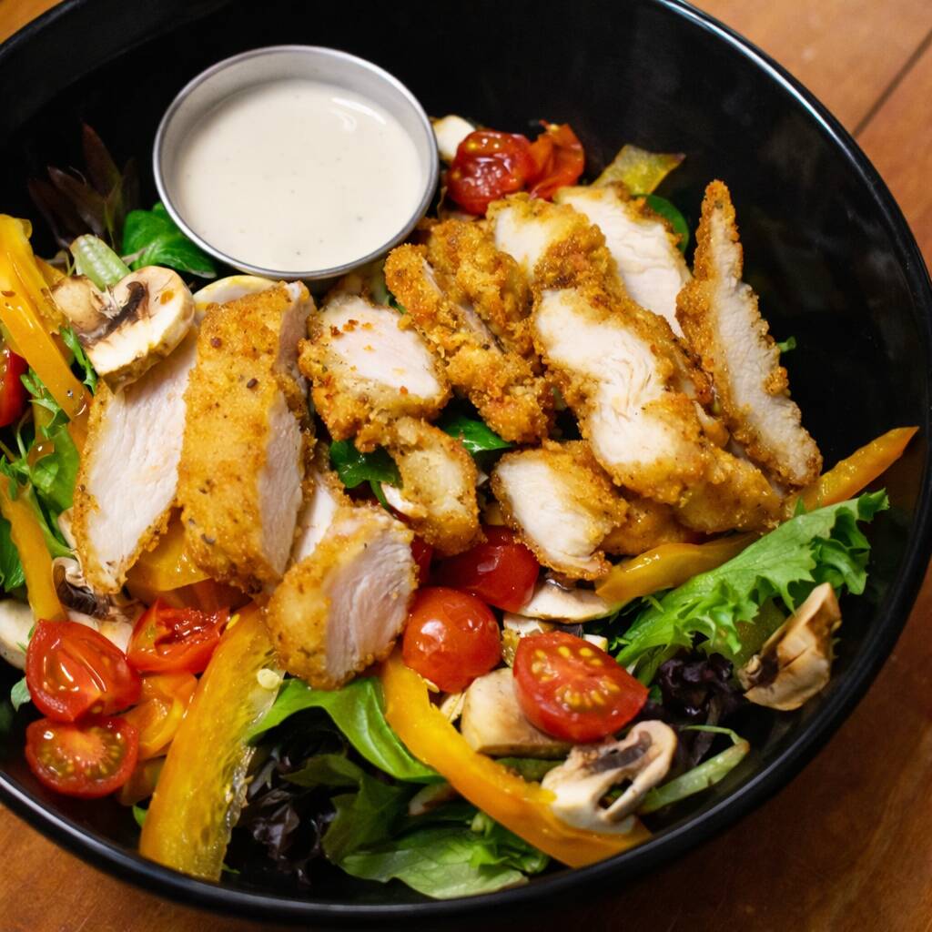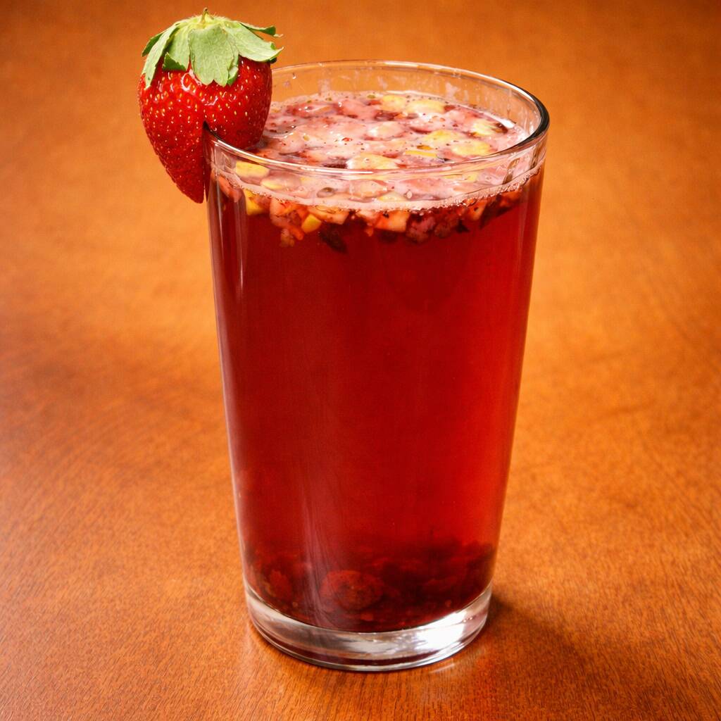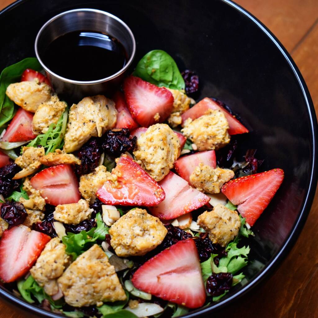 Ensalada fresca con pollo sazonado, fresas naturales y arándanos deshidratados, sobre una mezcla de hojas verdes con almendra crujiente. Acompañada de aderezo balsámico para un balance perfecto entre dulce y salado.