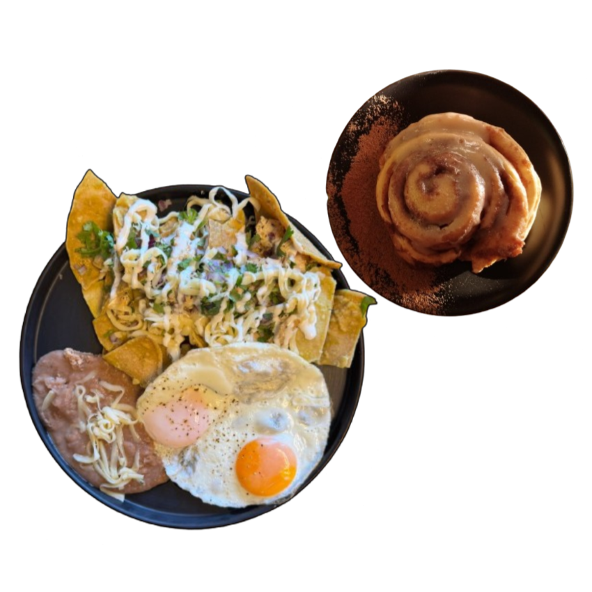 Chilaquiles Verdes: Ricos totopos bañados en salsa verde, con queso. Cilantro, cebolla y acompañados de frijoles refritos de la casa.