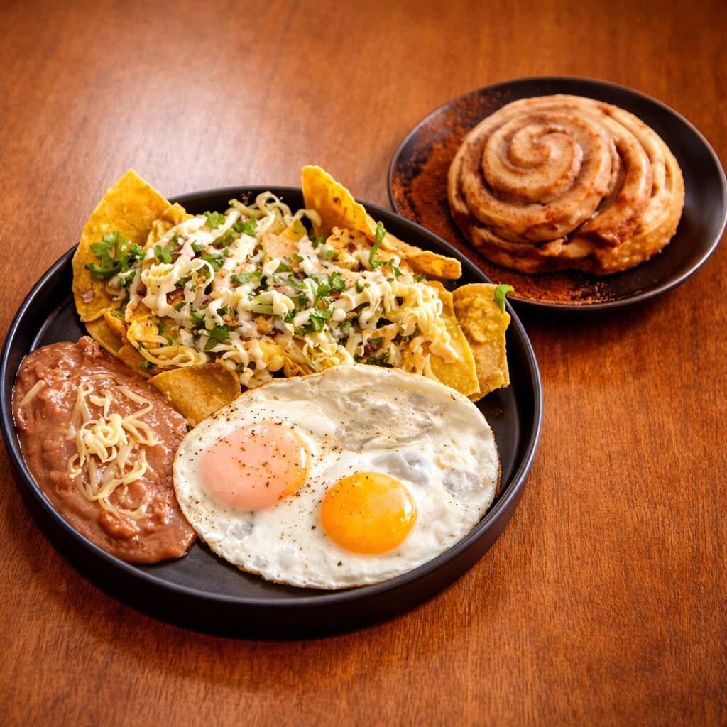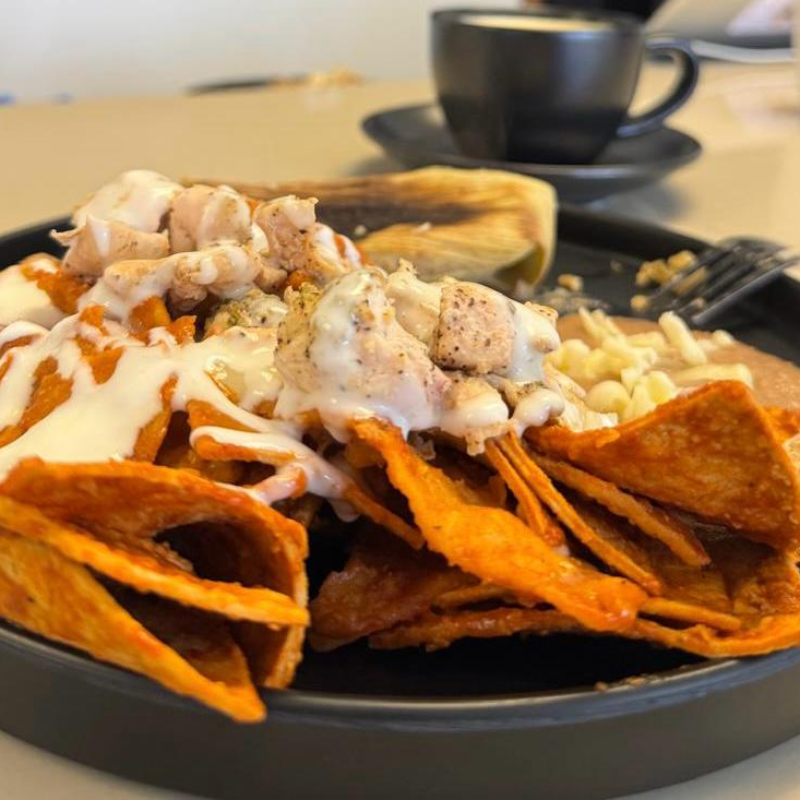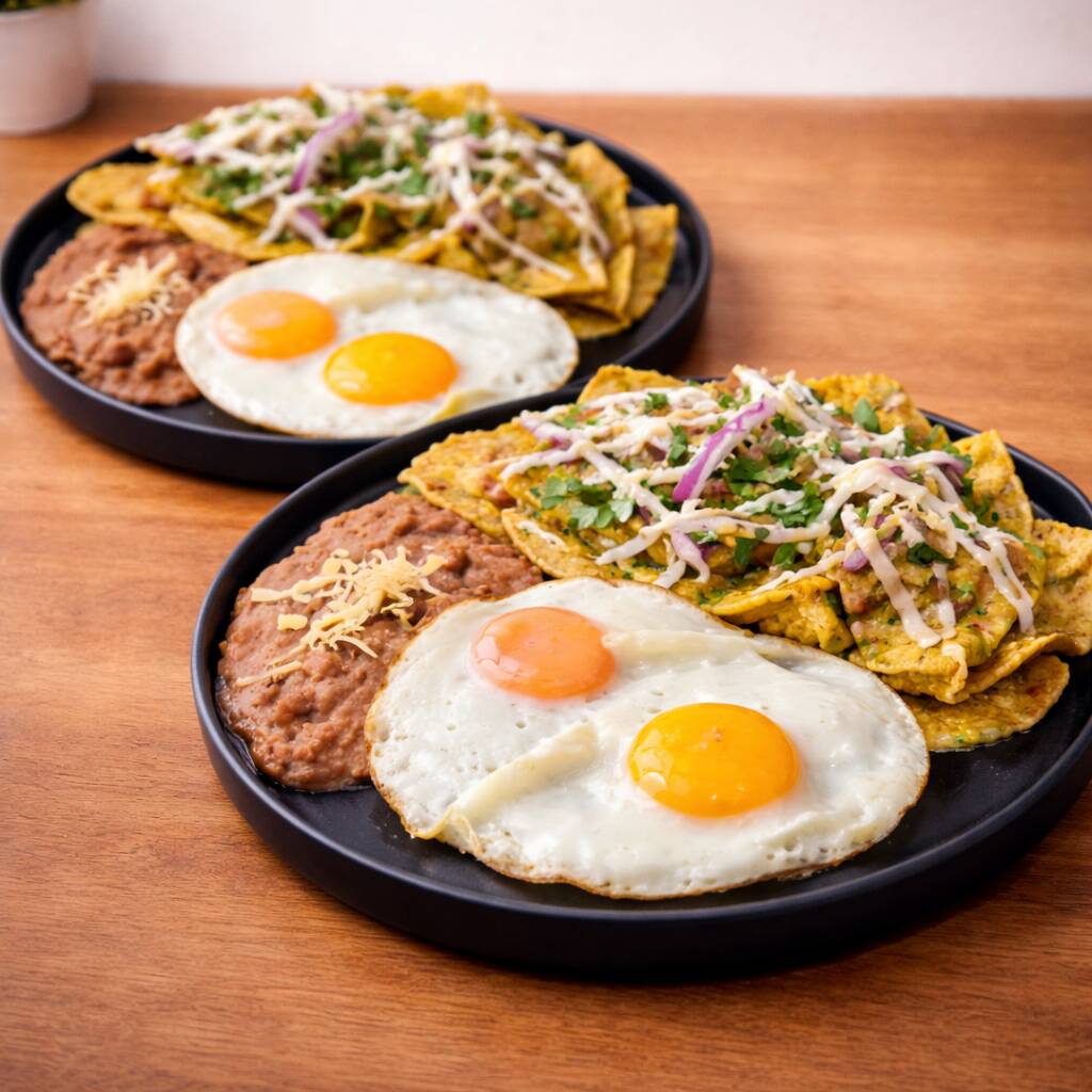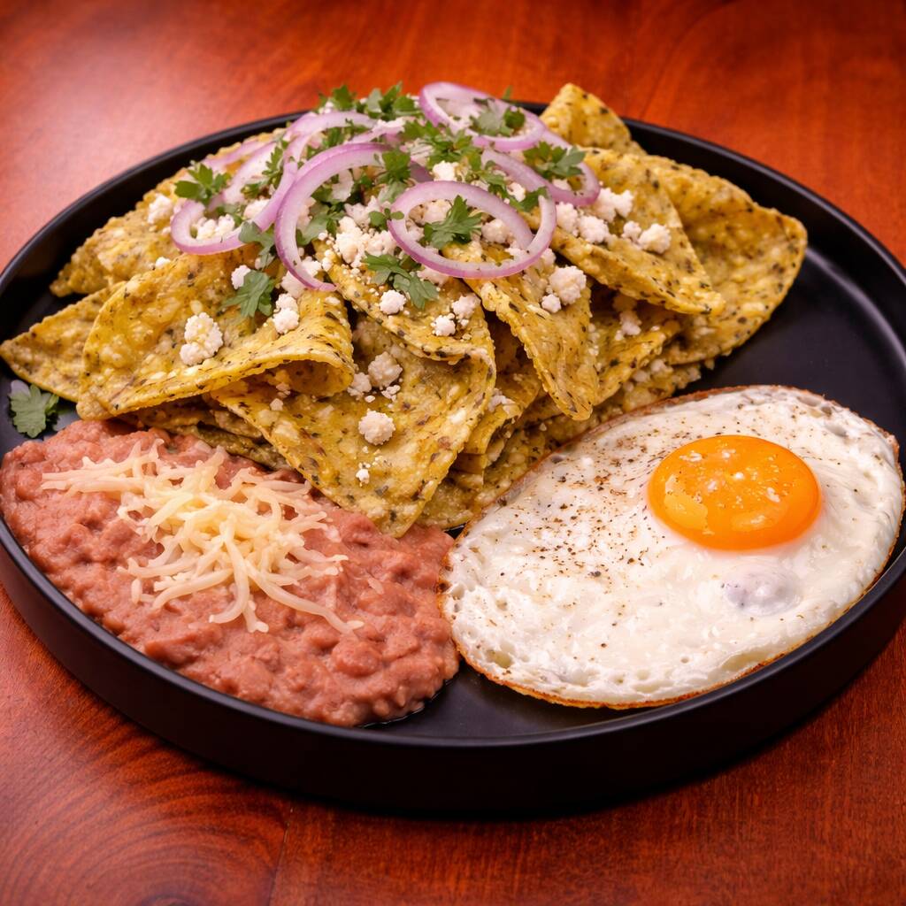 Chilaquiles Poblanos: Ricos totopos bañados en salsa poblana, con queso. Cilantro, cebolla y acompañados de frijoles refritos de la casa.