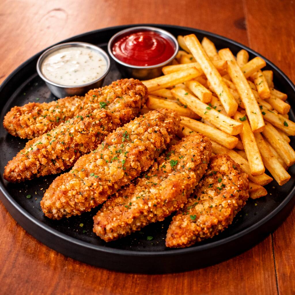Tiras de pechuga de pollo empanizadas y doradas al momento, crujientes por fuera y jugosas por dentro. Acompañadas de papas fritas recién hechas y salsa a elegir. Una opción clásica, abundante y perfecta para cualquier antojo.