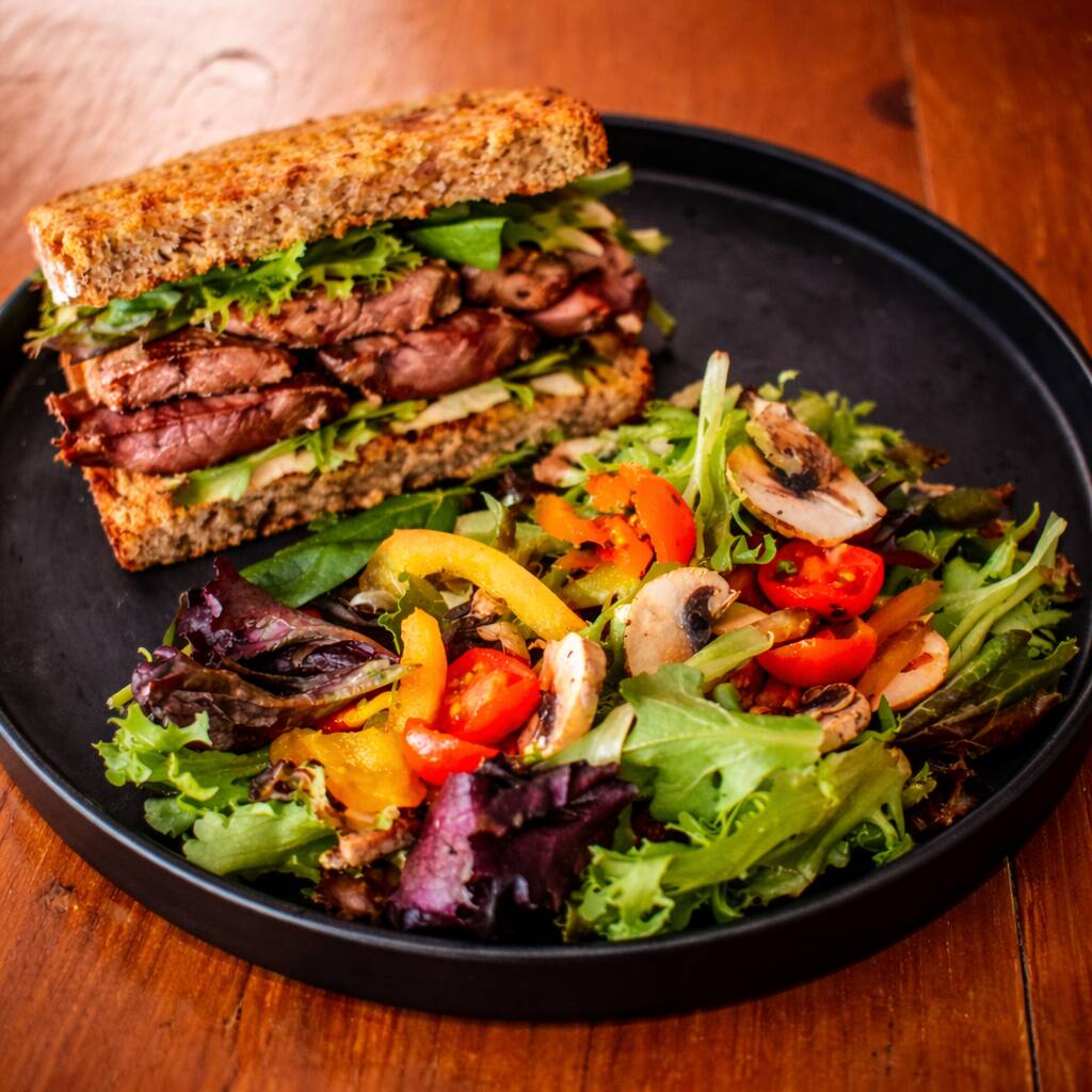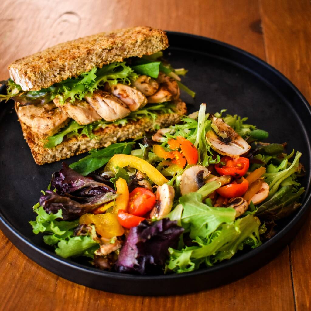 Pollo a la plancha sobre una cama de hojas frescas, con chile morrón, champiñones y tomates cherry. Ligera y deliciosa.