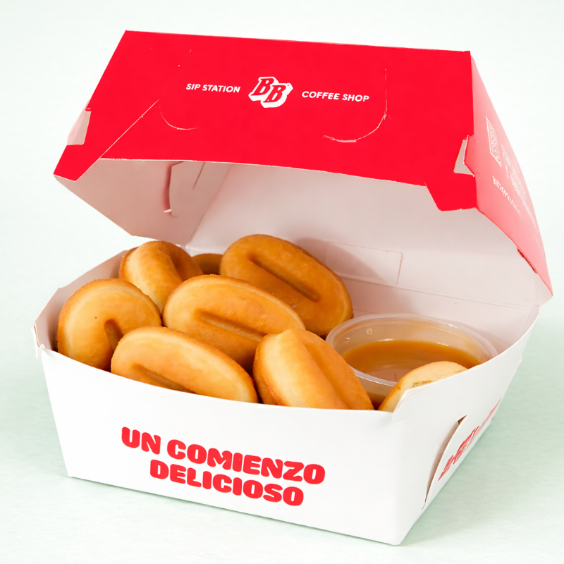 Waffle Bites más Latte Chico. Elige tu latte frio o caliente y el endulzante de tus waffles