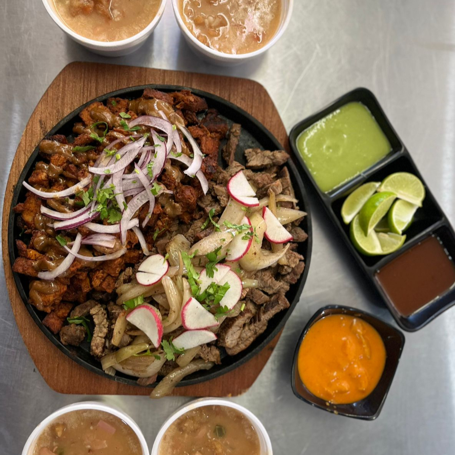 Una combinacion de nuestras 3 proteinas, Puerco,Pollo y Sirloin, acompañada de 20 tortillas y 4 frijoles charros.