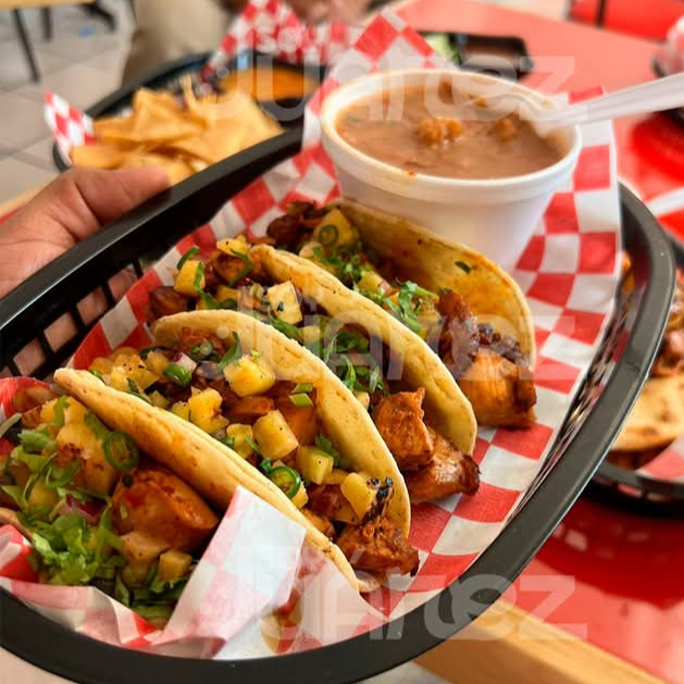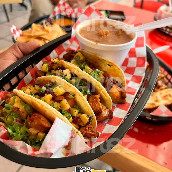 4 tacos de piernay muslo de pollo marinado en pastor y asados a la parrilla, cubiertos con una mezcla de piña,chile de arbol verde,cebolla morada,cilantro, acompañados de frijoles charros.