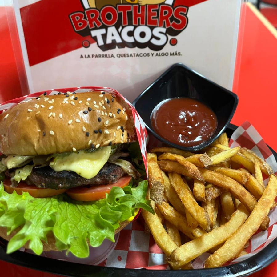 150 grs de carne molida de sirloin, queso americano,cebolla morada,pepinillos,tomate y lechuga,mayonesa y mostaza, acompanadas con papas fritas.