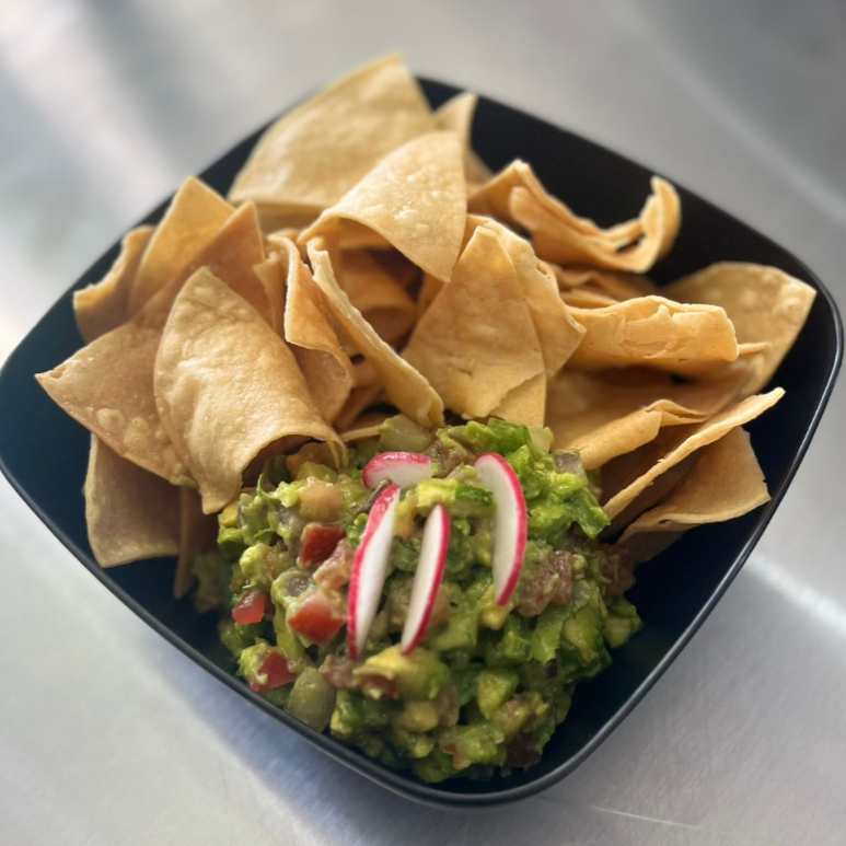 Hecho por orden,aguacate machacado,pico de gallo y totopos.