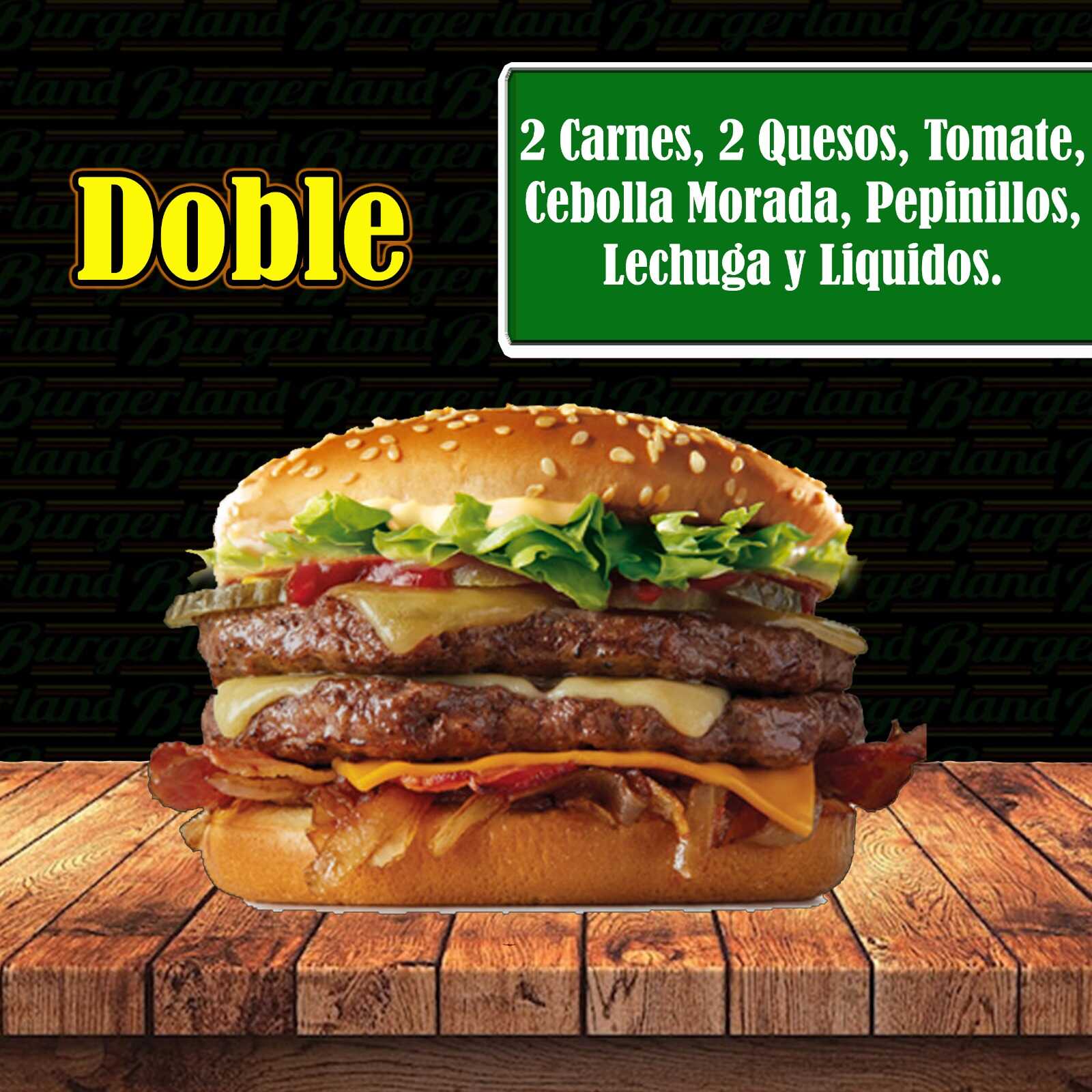 2 Carnes, 2 quesos, cebolla morada, tomate, lechuga, pepinillos y líquidos.