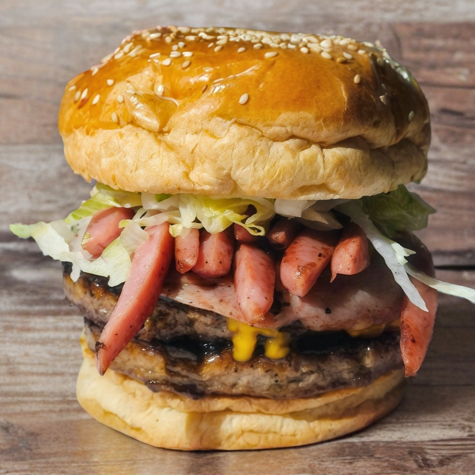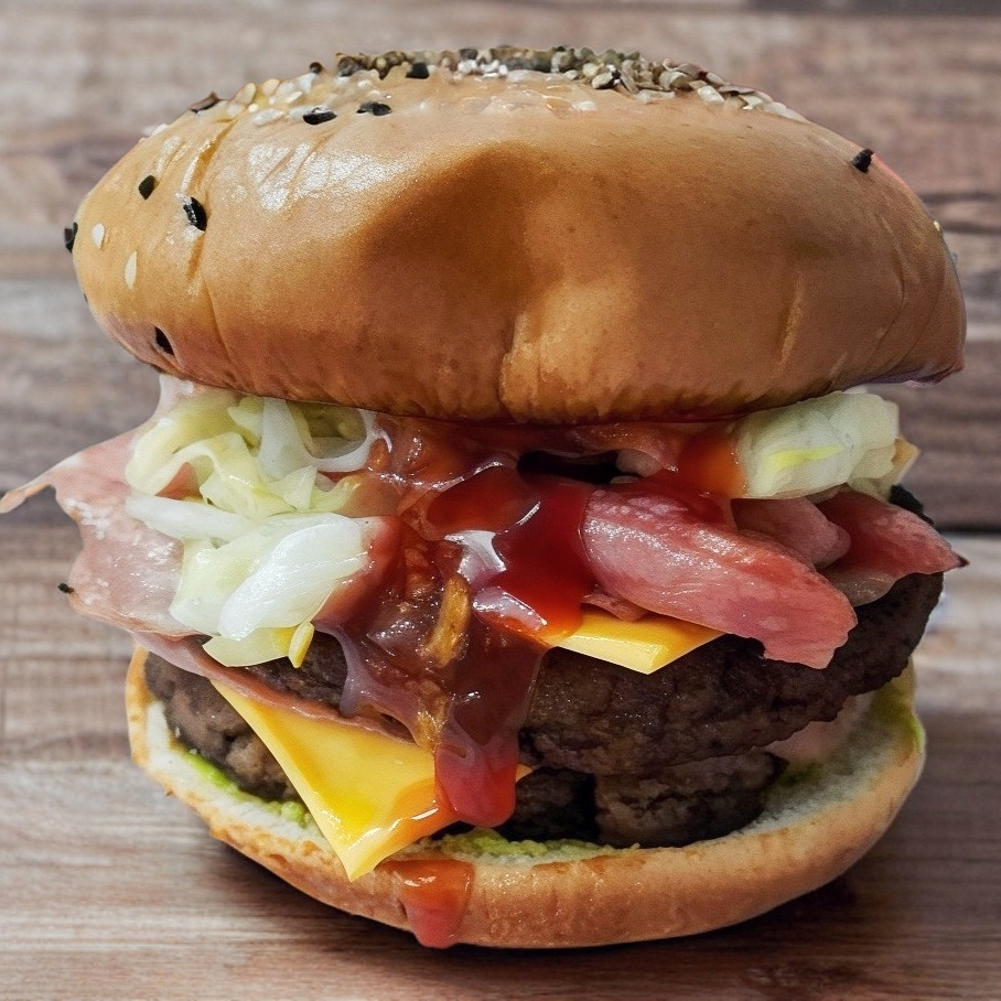 doble carne de sirlon, aguacate, jamon,queso,winnie,mayonesa,capsup,mostaza, lechuga y tomate