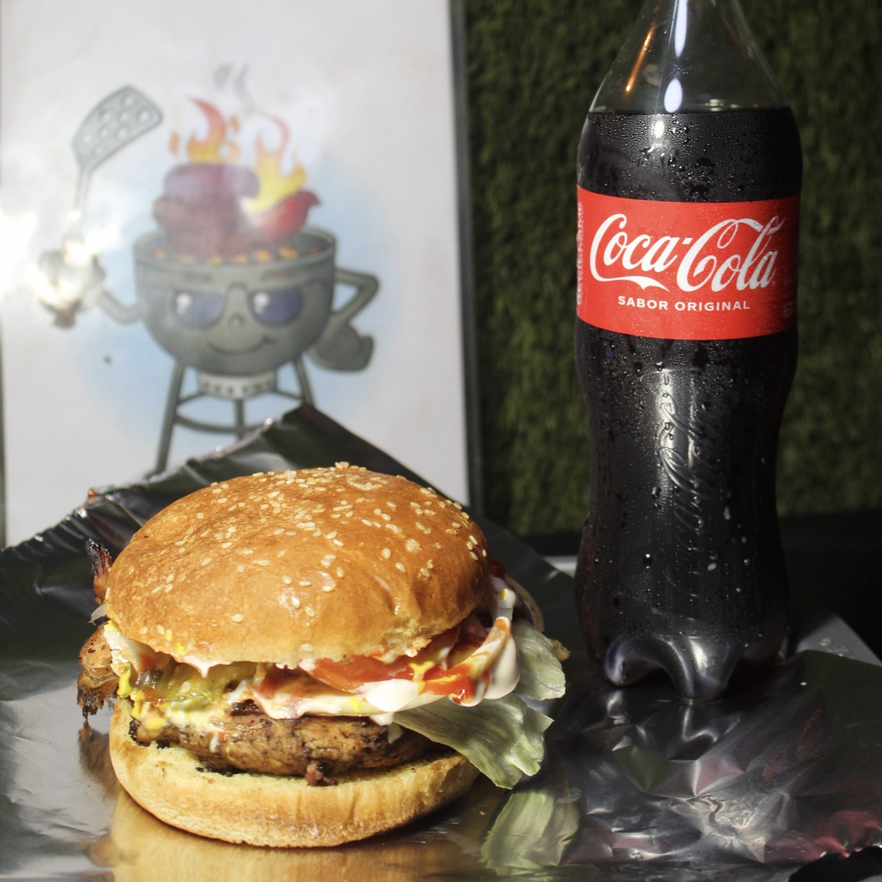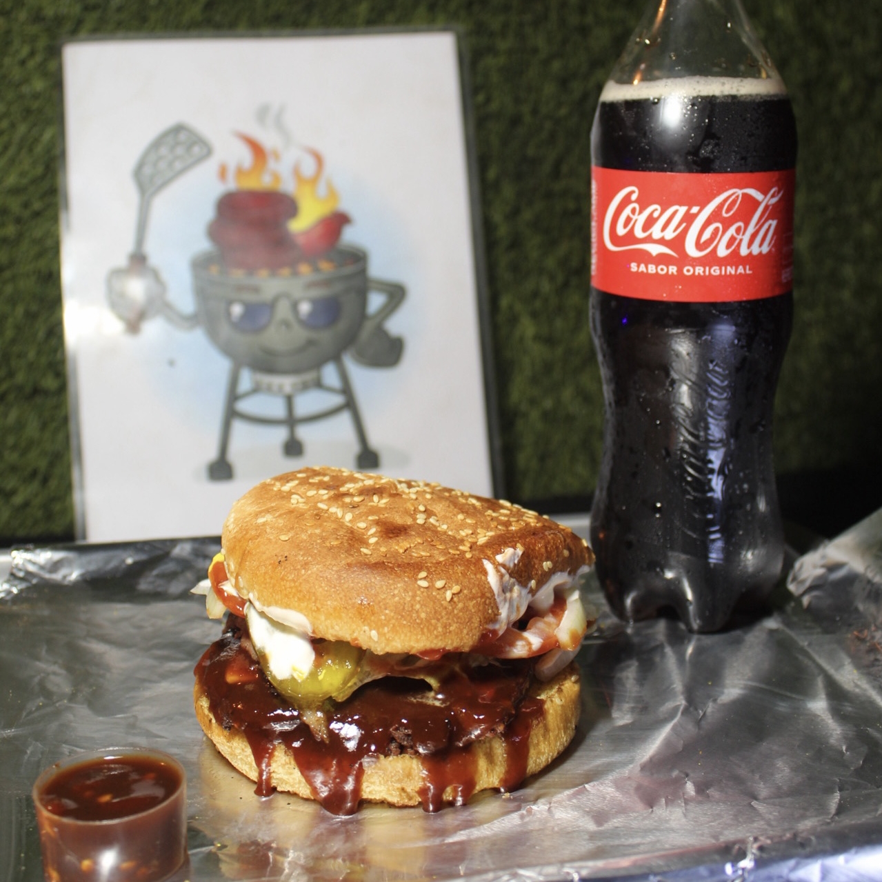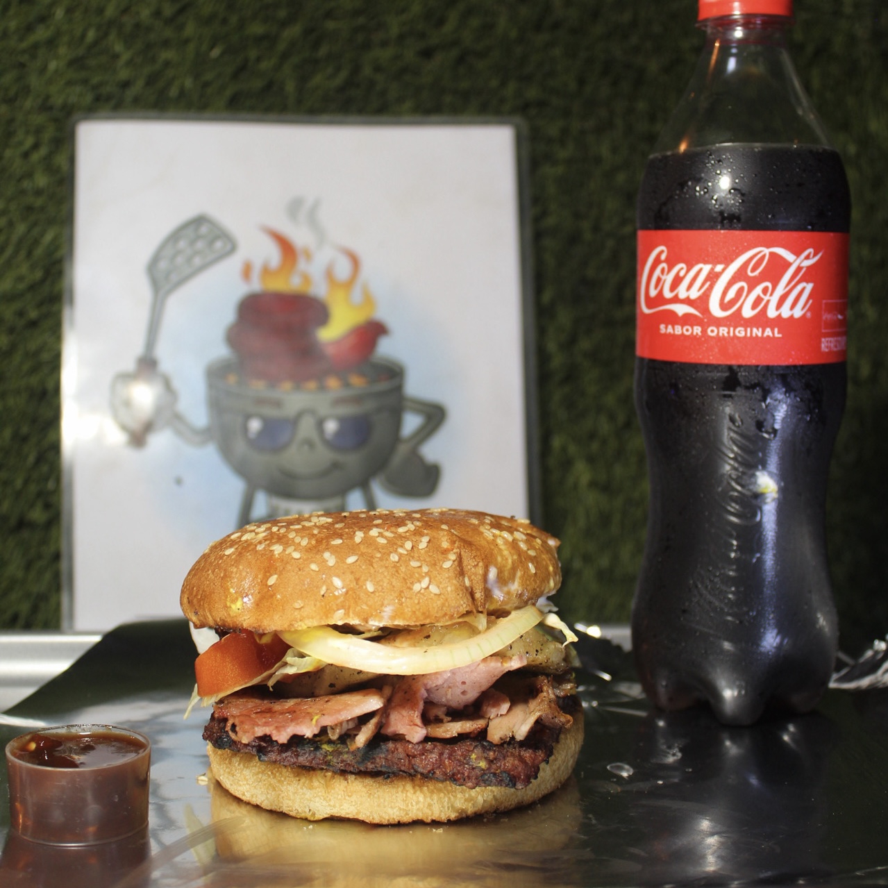PAN, CARNE SIRLOIN, QUESO AMARILLO, TOCINO, SALSA BBQ, LECHUGA, TOMATE, CEBOLLA, PEPINILLOS, MAYONESA, CATSUP