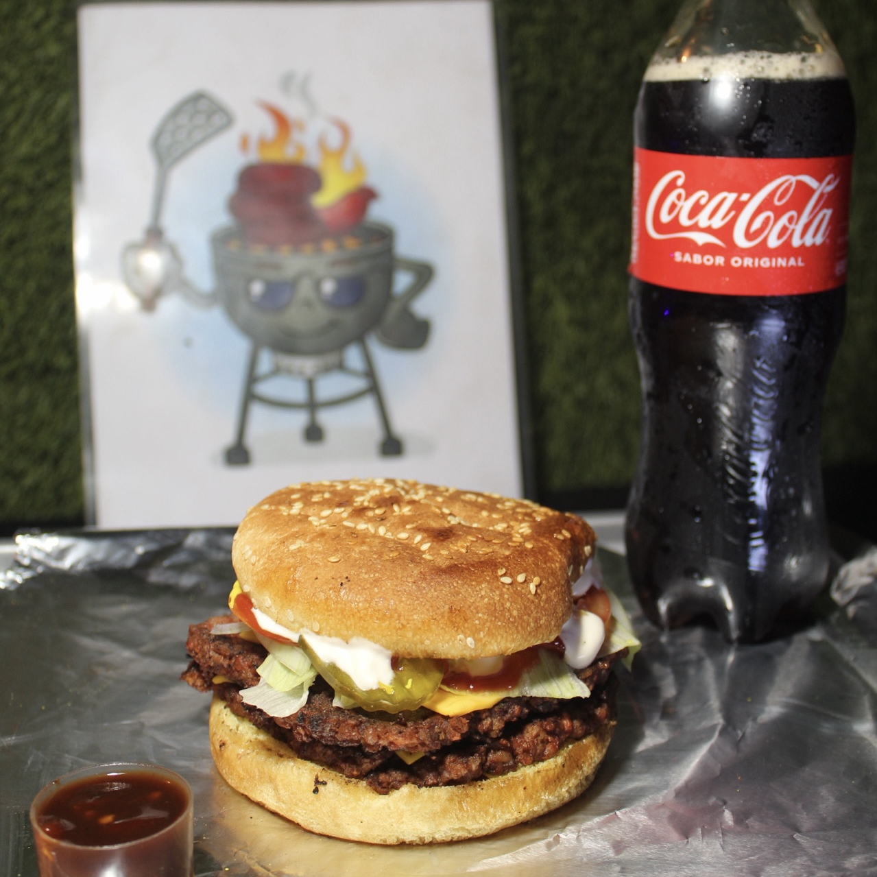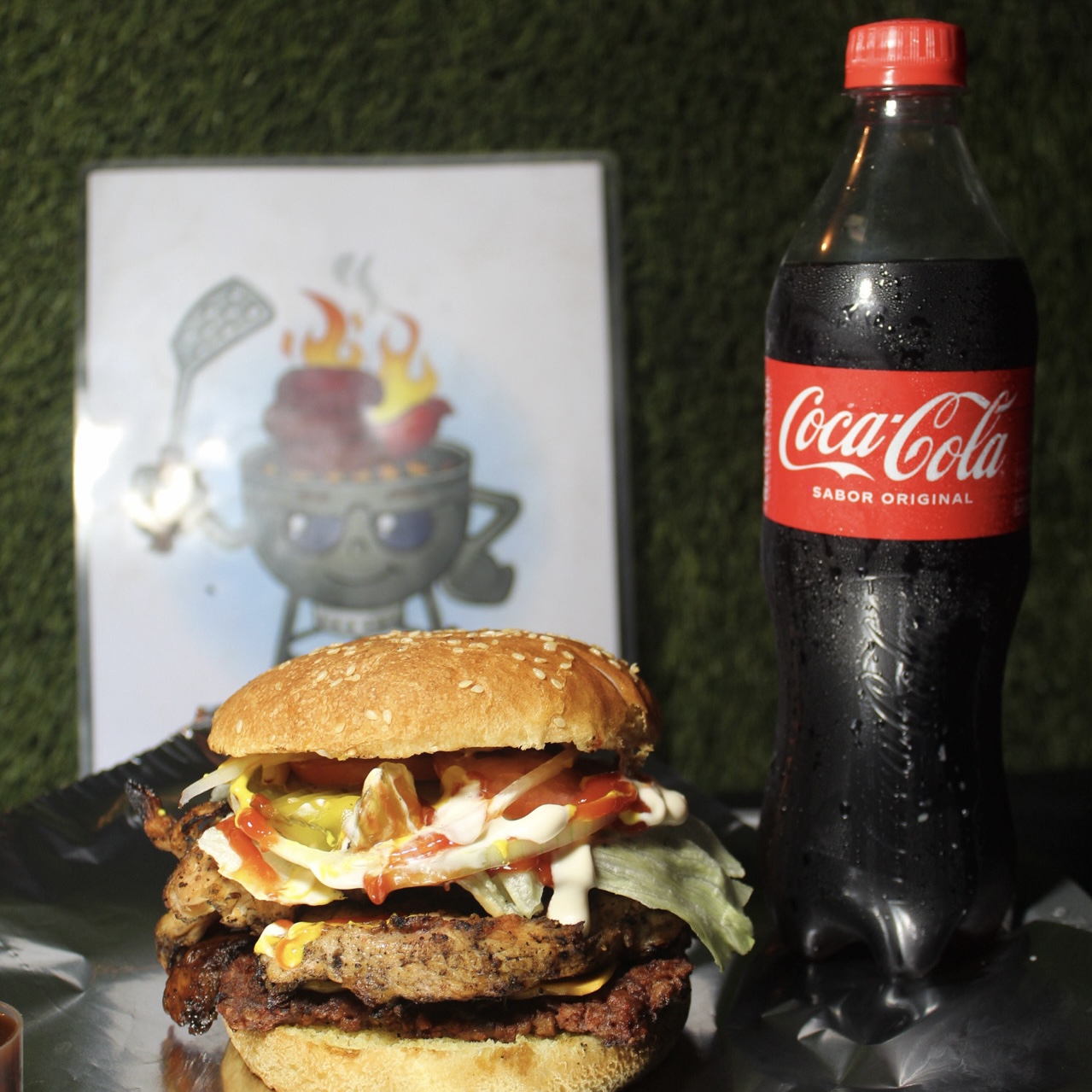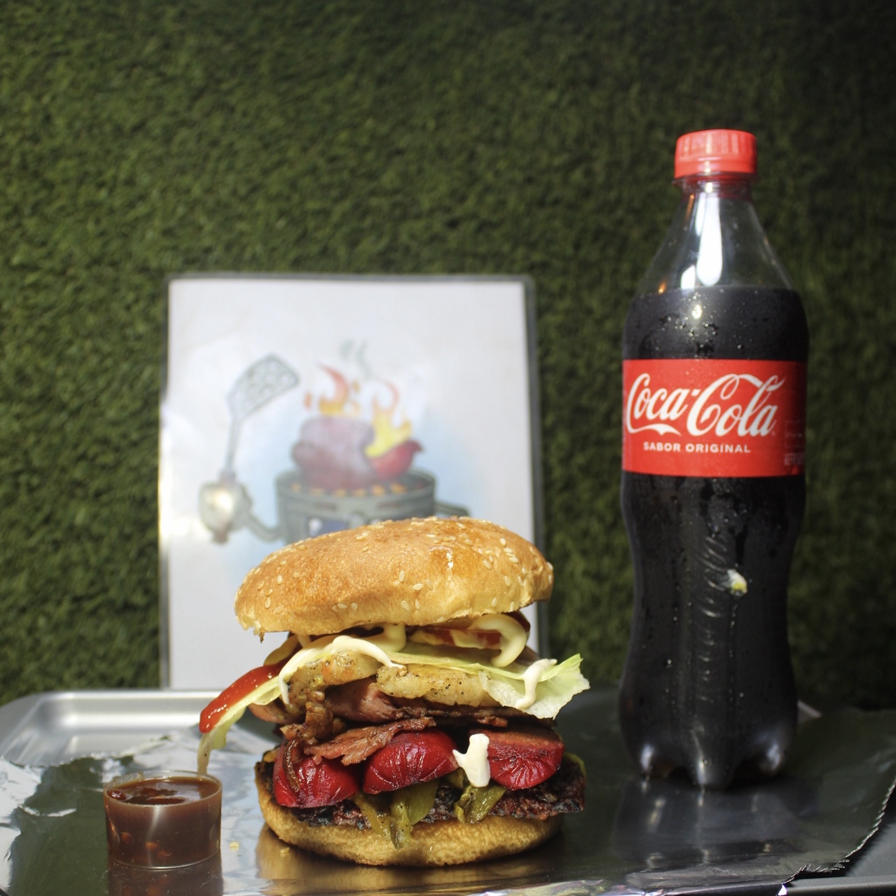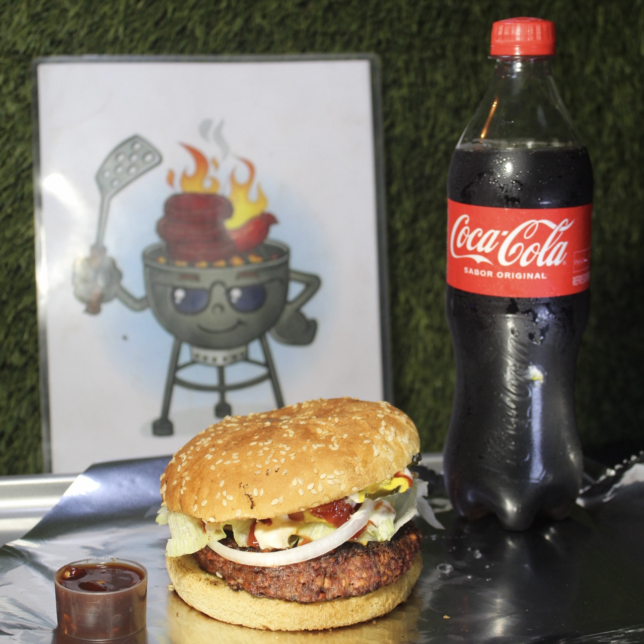 PAN, CARNE SIRLOIN, QUESO AMARILLO, TOCINO, SALSA BBQ, LECHUGA, TOMATE, CEBOLLA, PEPINILLOS, MAYONESA, CATSUP