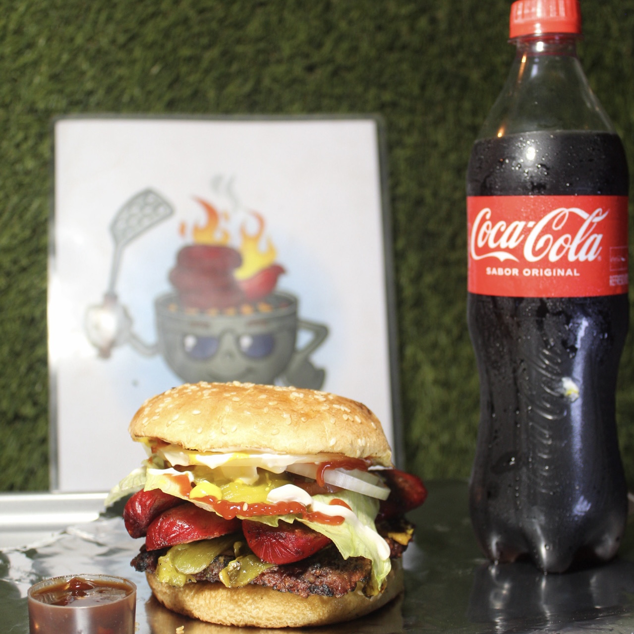 PAN, CARNE SIRLOIN, QUESO AMARILLO, SALCHICHA PARA ASAR, CHILE CALIFORNIA, LECHUGA, TOMATE, CEBOLLA, PEPINILLOS, MAYONESA, CATSUP