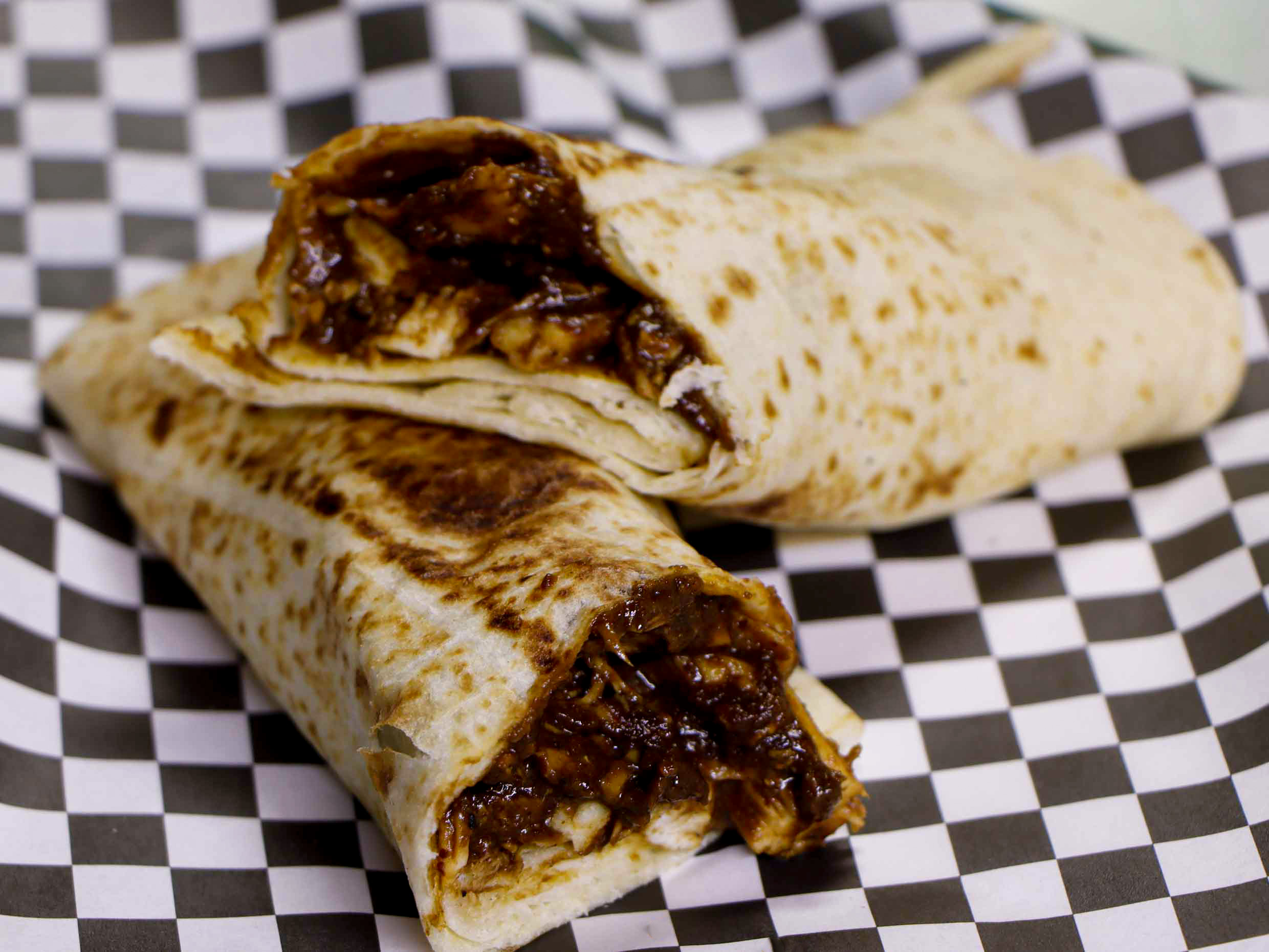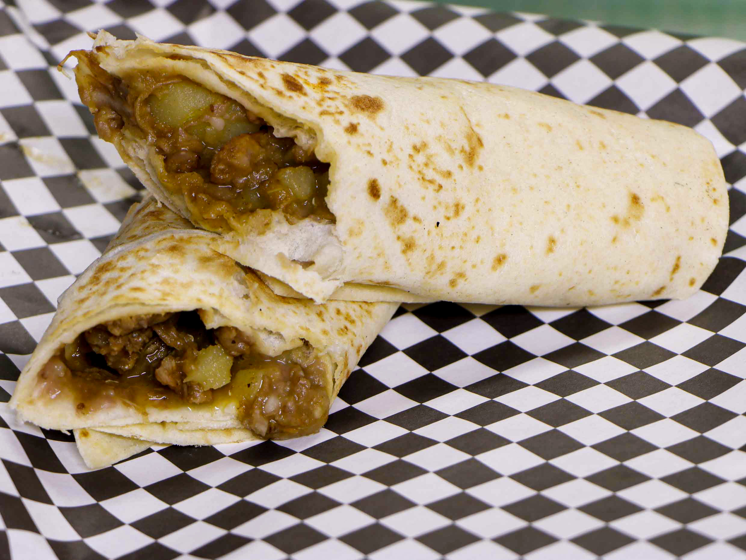Carne de res deshebrada cocinada con chile, tomate y cebolla. Todos nuestros burritoks llevan frijoles a menos que indiques lo contrario.