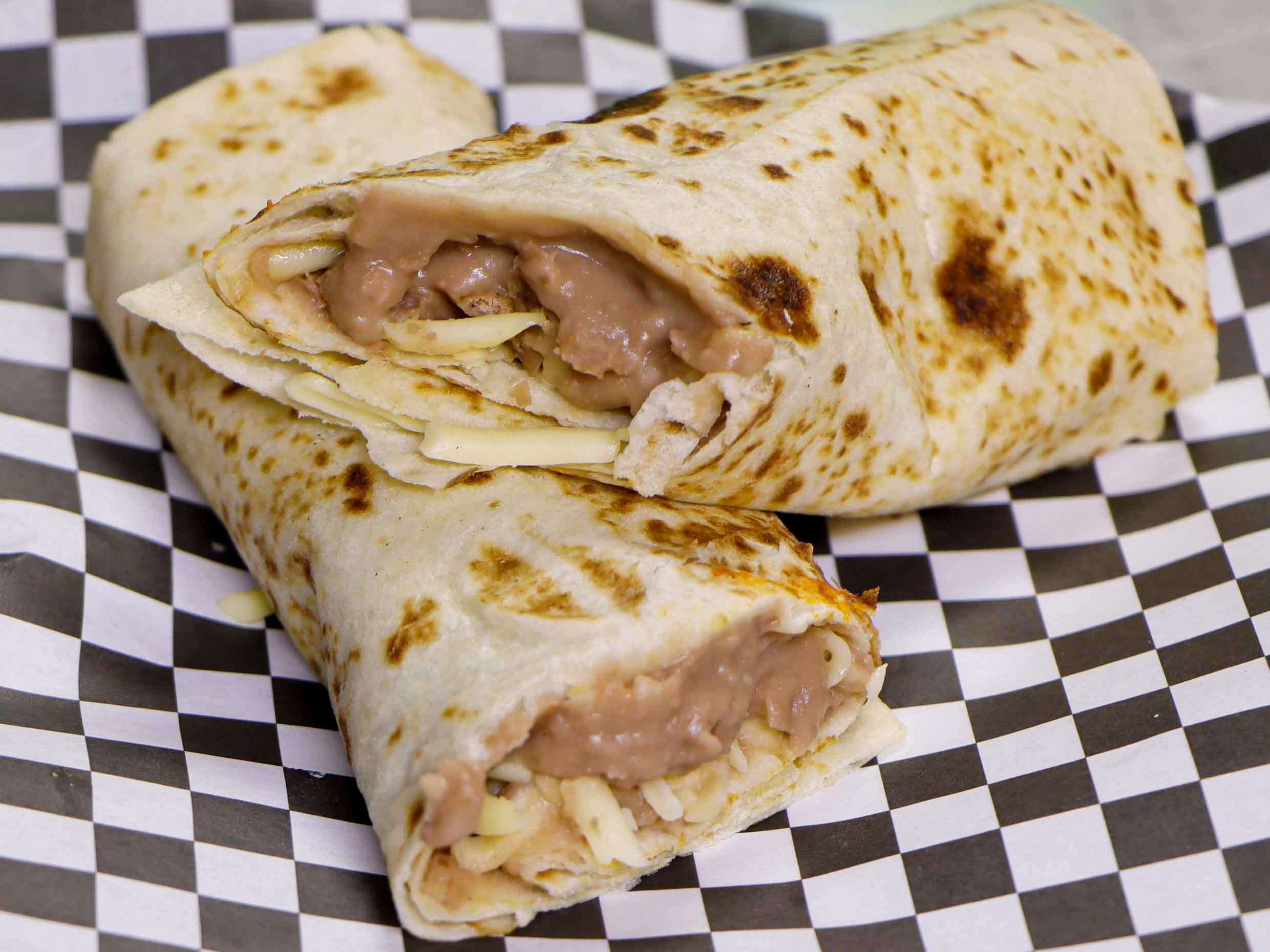 Frijoles refritos con queso estilo chihuahua que se gratina dentro del burrito.