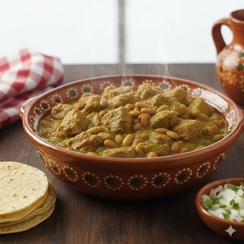 Burrito bien Servido de Puerco con frijol graneado en Deliciosa salsa Verde (Tortilla Hecha a mano)