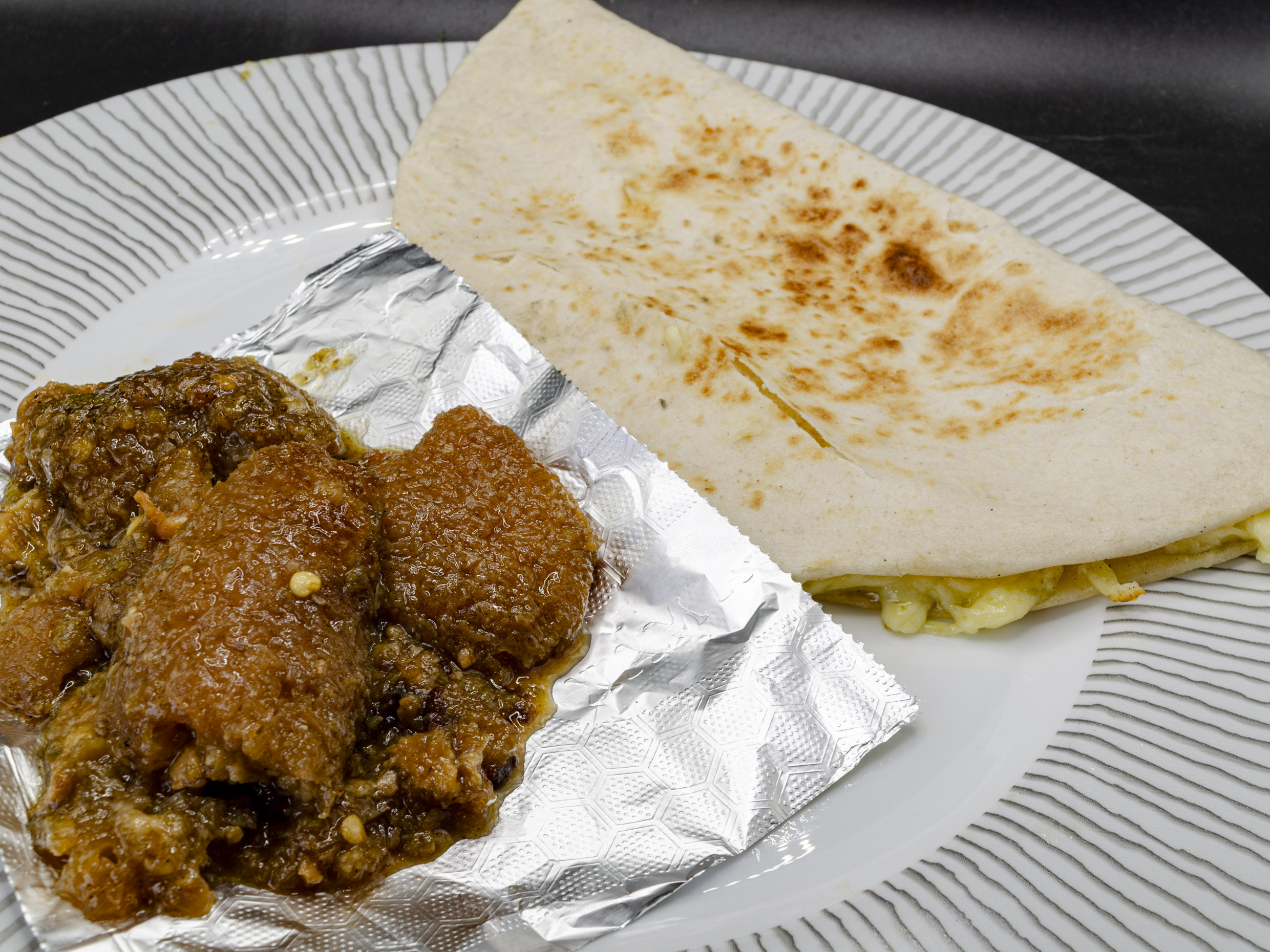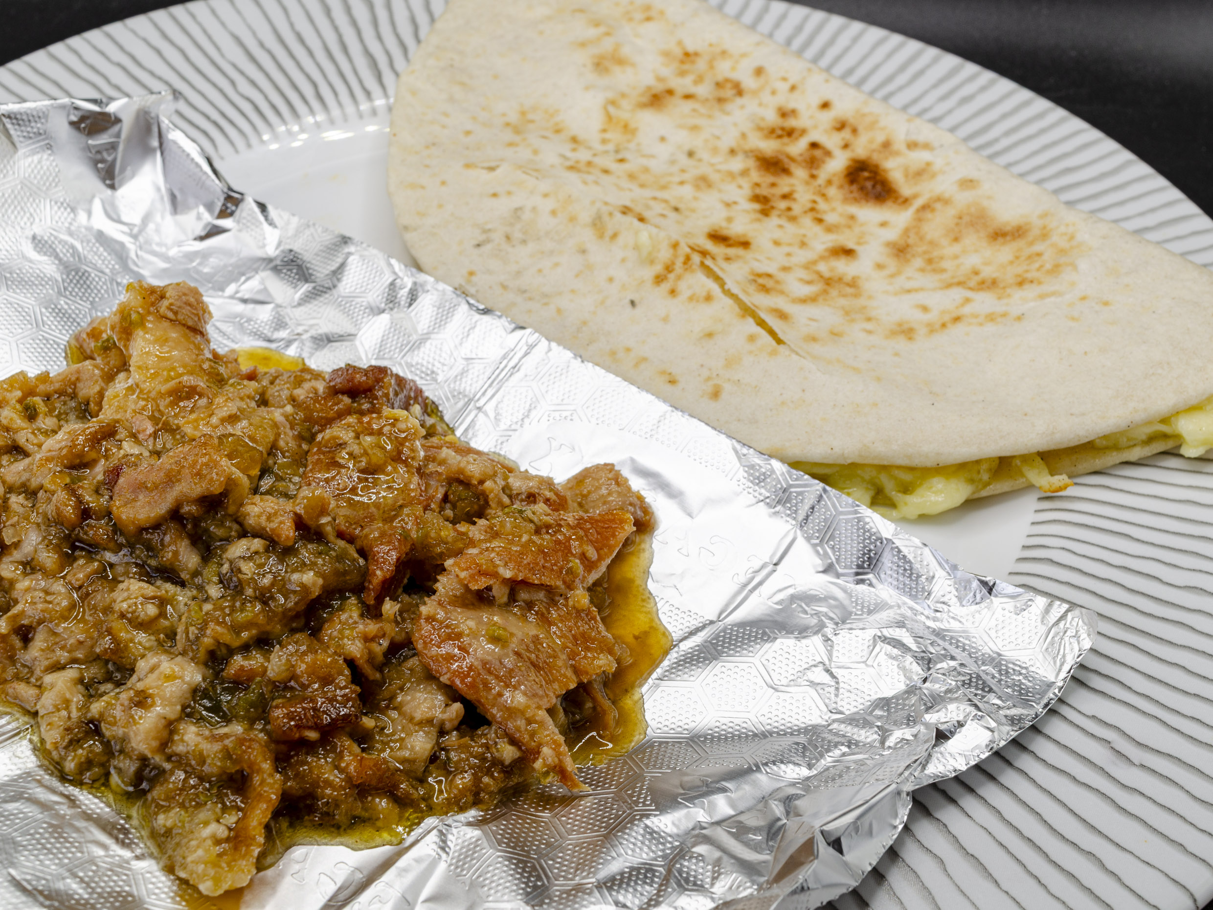 Quesadilla en tortilla de harina con queso y chicharrón pella