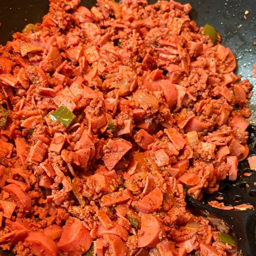 Carnes frías, molida de res, chorizo y trozos de cebolla y chile
