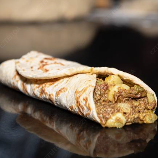 Burritos en tortilla de harina, carne deshebrada con papas en salsa roja.