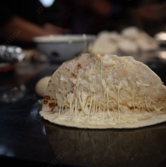 Queso derretido en tortilla dorada.