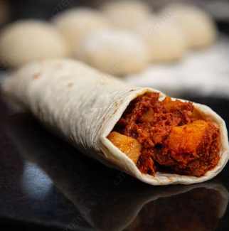 Burritos en tortilla de harina, carne deshebrada con papas en salsa roja.
