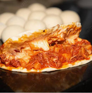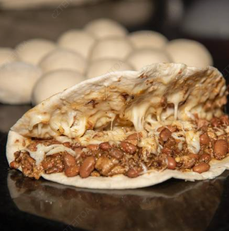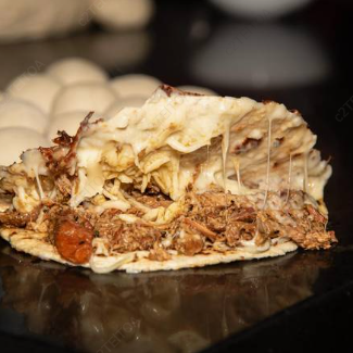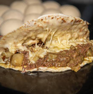 Quesadilla de carne deshebrada y papas en salsa roja con queso.