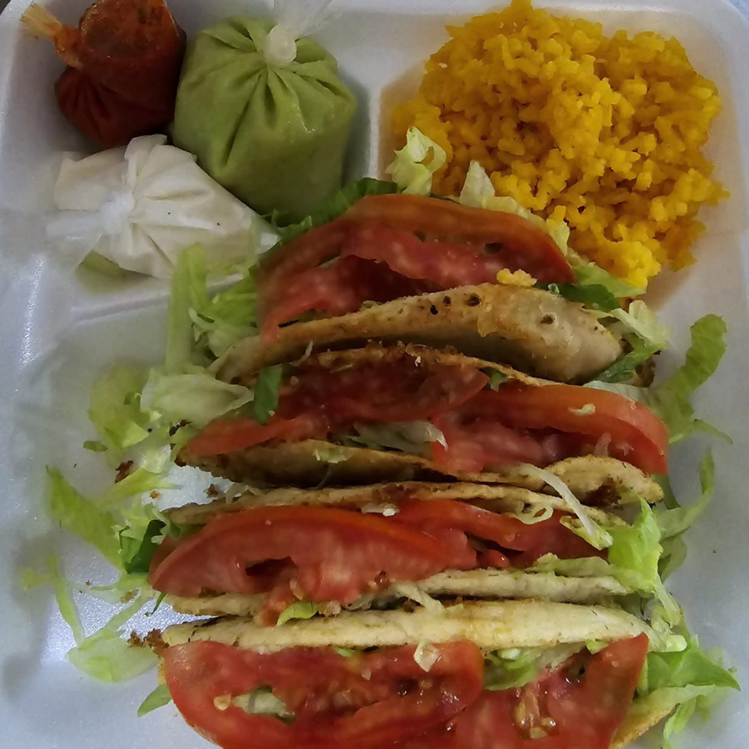 4 tacos acompañado con arroz
