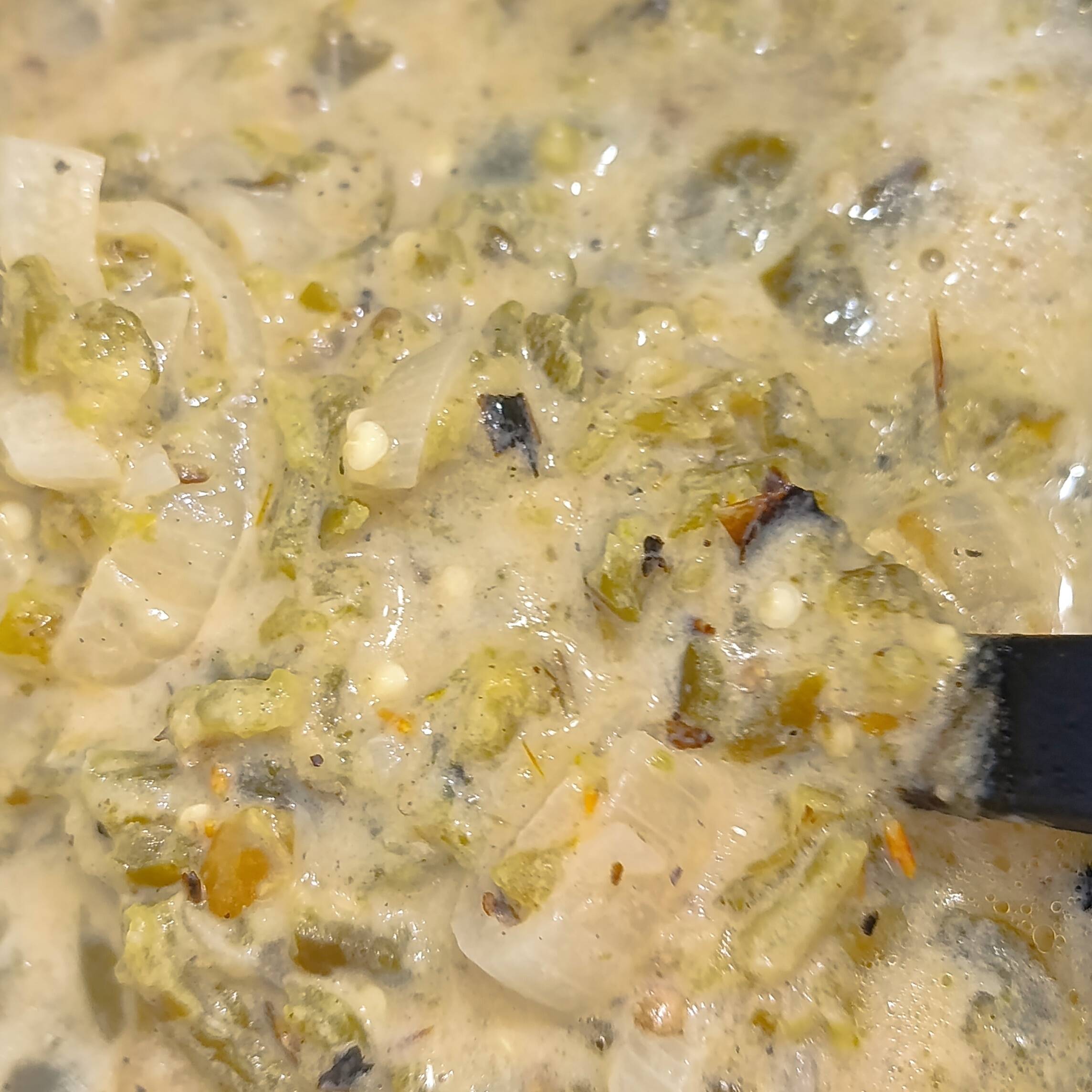 CHILE CALIFORNIA EN RAJAS, CON MEDIA LUNAS DE CEBOLLA , QUESO MENONITA Y CREMA