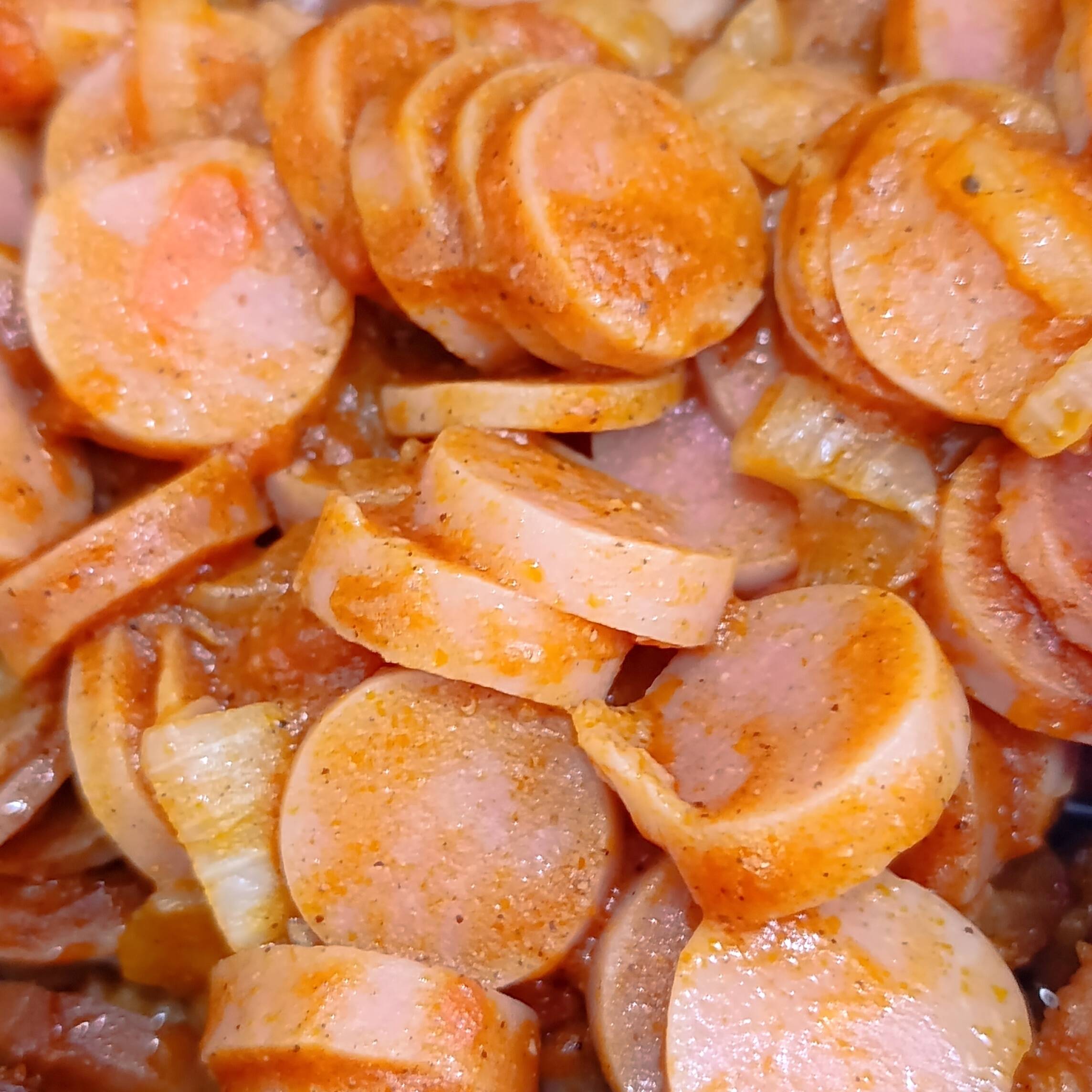 SALCHICHA EN RODAJAS, CON SALSA DE TOMATE Y ESPECIES
