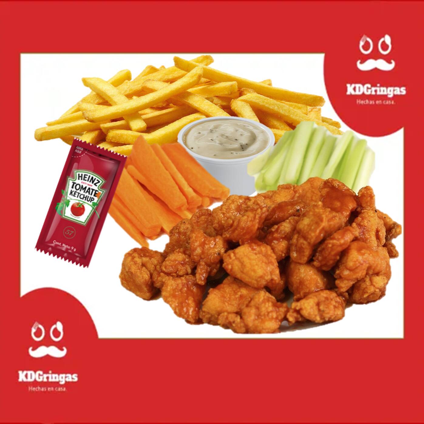 150g de boneless 100% pechuna, salsa a escoger, salsa ranch, zanahoria, apio y una porcion de papas con catsup