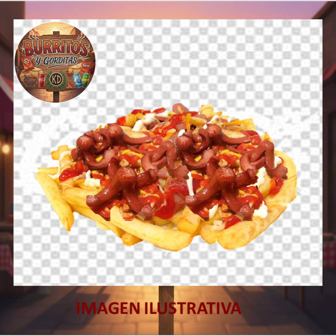 Papas fritas naturales, salchicha, mayonesa, cátsup y queso para nachos