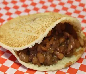 Es un chile relleno de queso capeado con huevo y se acompaña con frijoles y una tortilla de harina hecha a mano