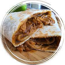 Burrito de mole con pechuga de pollo y un toque de frijoles refritos.