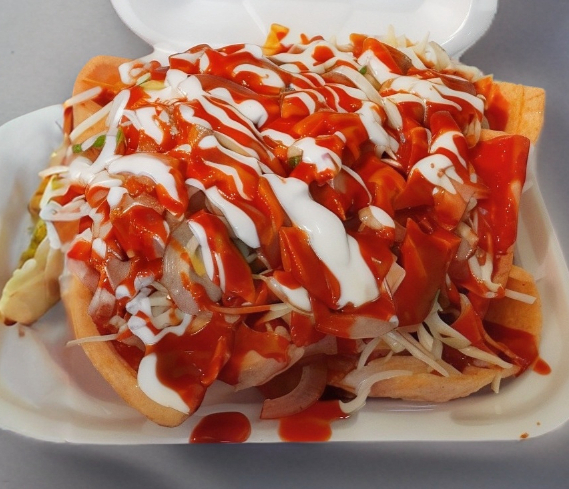 Papas a elegir, Repollo, Tomate , cueritos, Aguacate ,Crema , Salsa valentina
