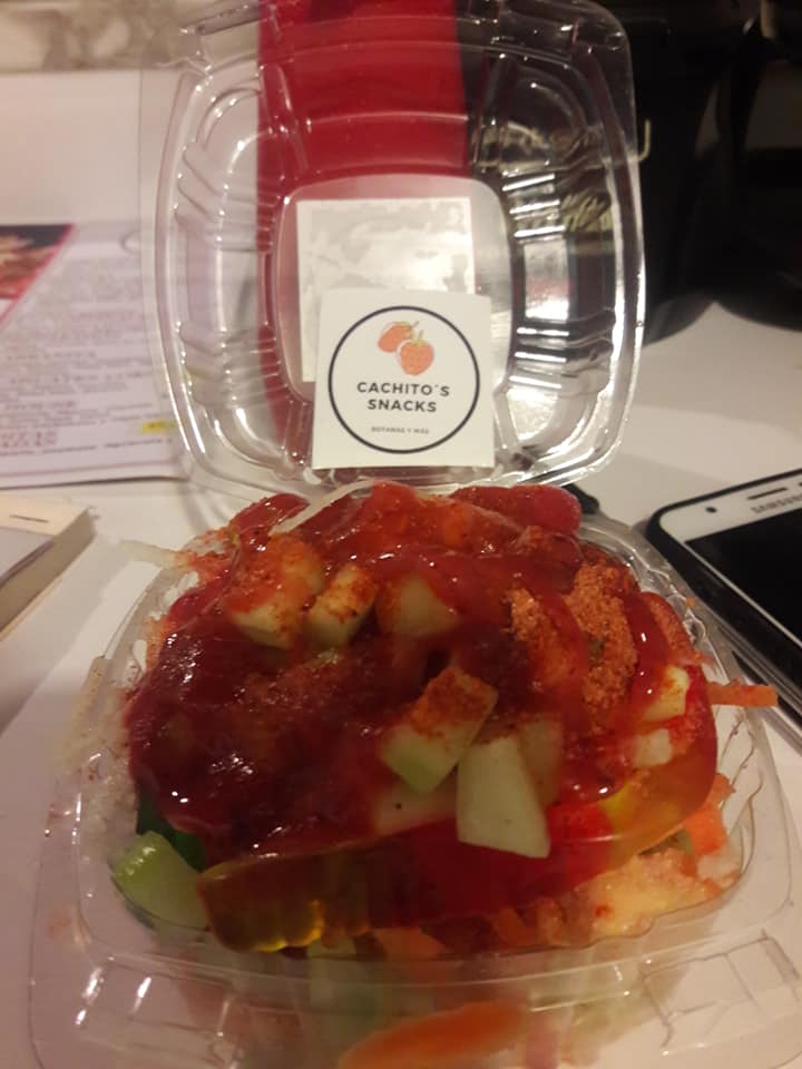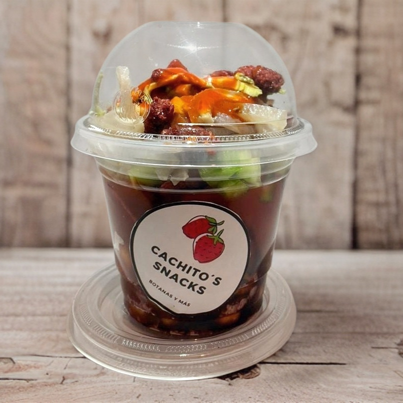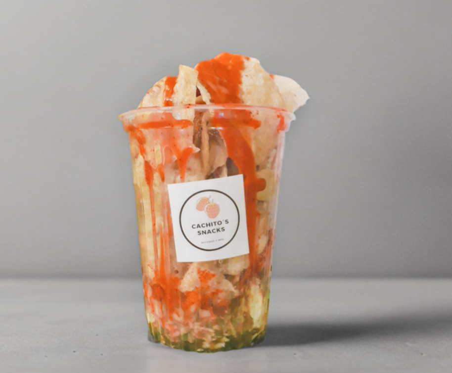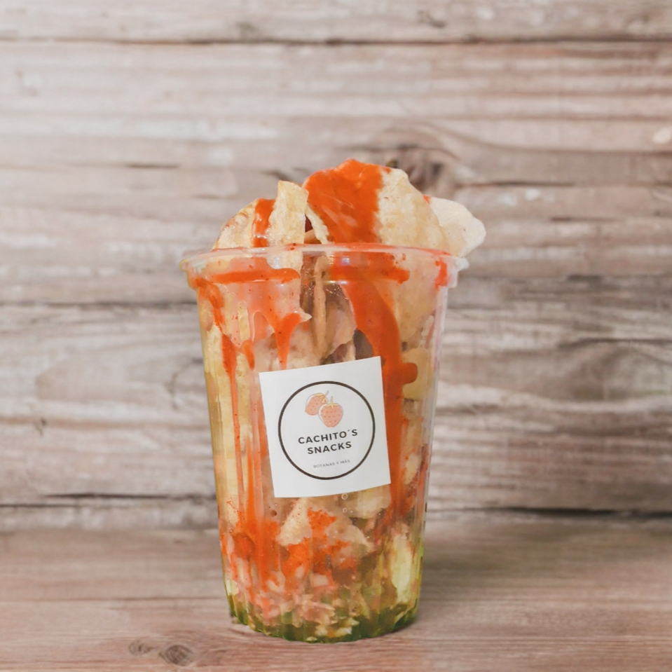 Jícama, zanahoria, pepino, chamoy, limón, salsa soya, papas caseras ,cacahuate y gomita enchilada ras, gomitas enchiladas, salsa a elección.