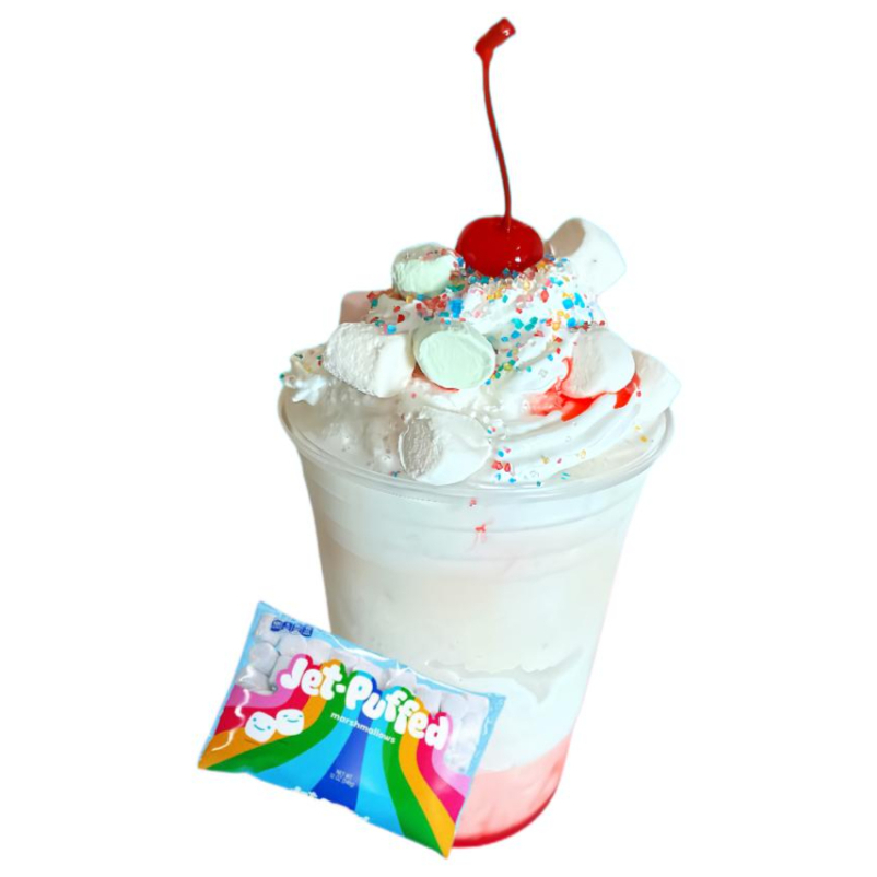 Frappé hecho con base de crema de malvavisco Jet-puffed, leche entera de vaca, hielo frappeado y topping de crema batida con bombones, una cereza y el toque divertido de azúcar de colores. !A los niños (y no tan niños) les encanta!