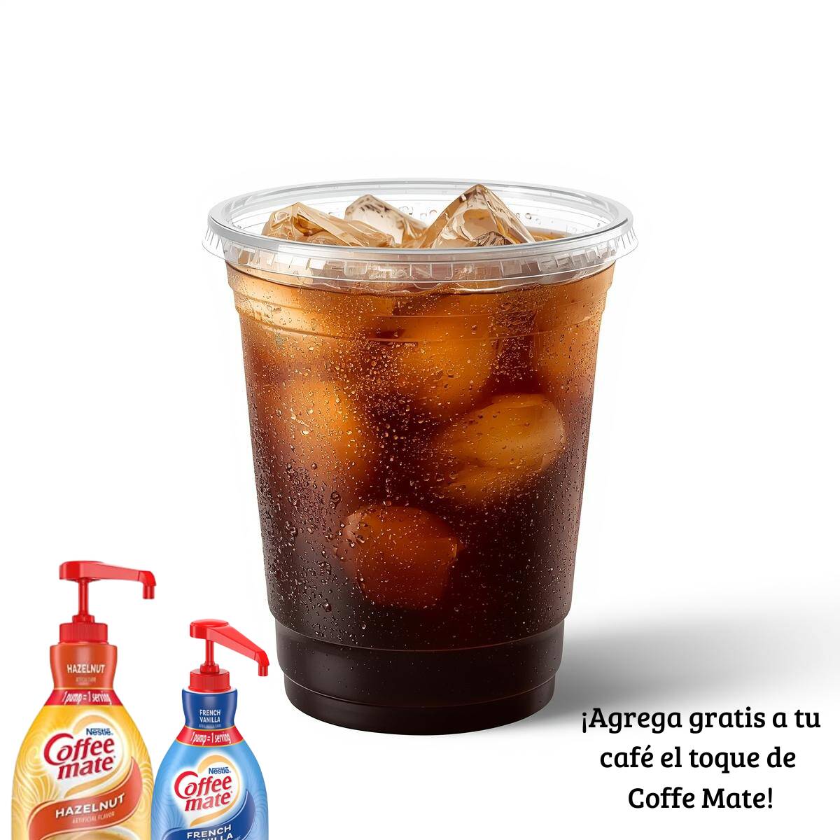 2 oz de café de especialidad "Latitud" extraído con nuestra Expobar y hielo. Puedes agregar el toque cremoso y dulce de tu Coffe Mate favorito (vainilla o hazelnut)