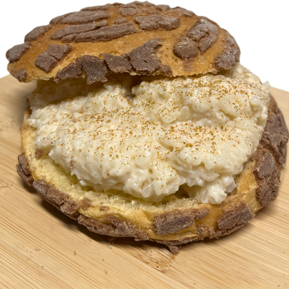 Elije tu pan casero (puede ser concha, cuernito, bisket o blanco) con relleno de Arroz con Leche y espolvoreado con canela molida.
