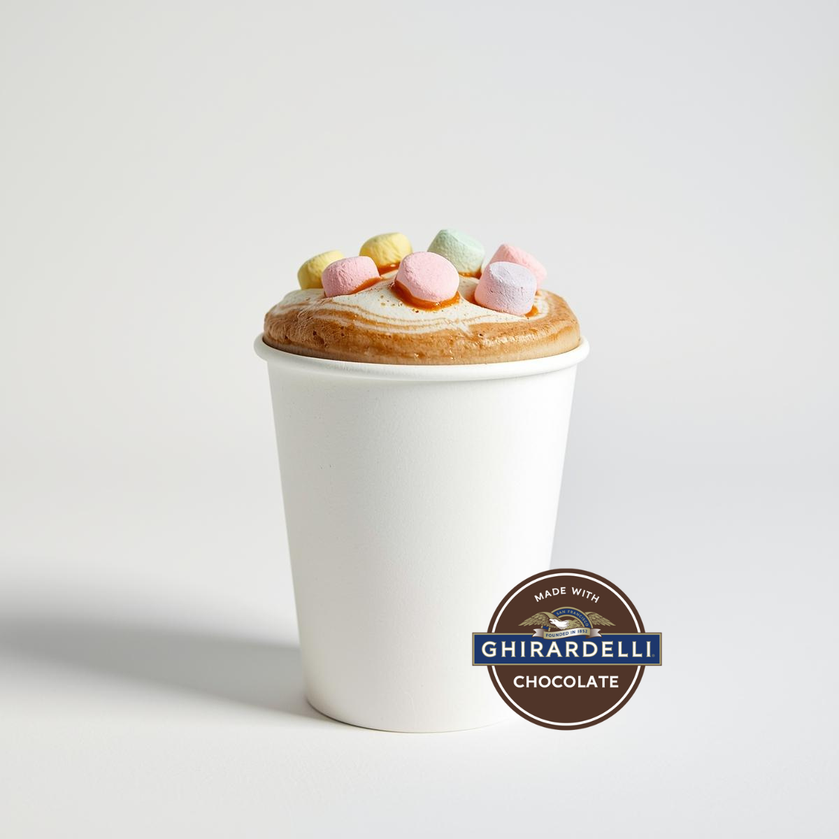 Chocolate en polvo premium "Ghirardelli", leche entera de vaca cremada cuidadosamente, y un toque de mini bombones.