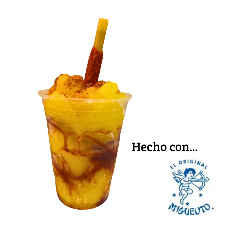 Frappé hecho con base de mango 100% natural, hielo frappeado, un toque picosito de chamoy líquido, topping de mango en trocitos, dulce de Miguelito en polvo y una banderilla de tamarindo enchilado.