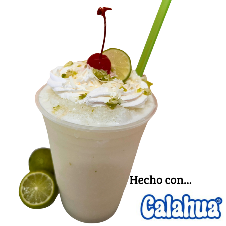 Jugo de limón fresco, crema de coco Calahua, hielo frappeado, topping de crema batida, ralladura de coco y de limón con una cereza.