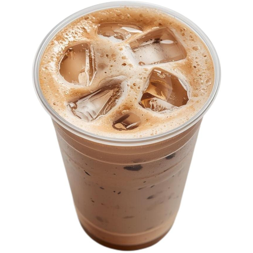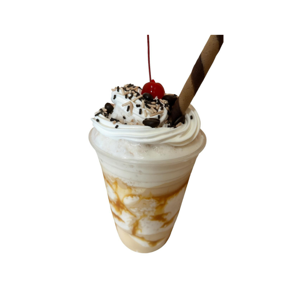 2 oz de café de especialidad "Latitud" extraído con nuestra Expobar, leche entera de vaca, hielo, syrup de caramelo, topping de crema batida con granillo de chocolate, una cereza, una waffer stick y un toque de granos de café.