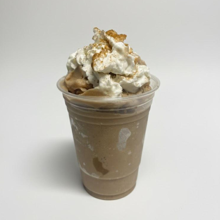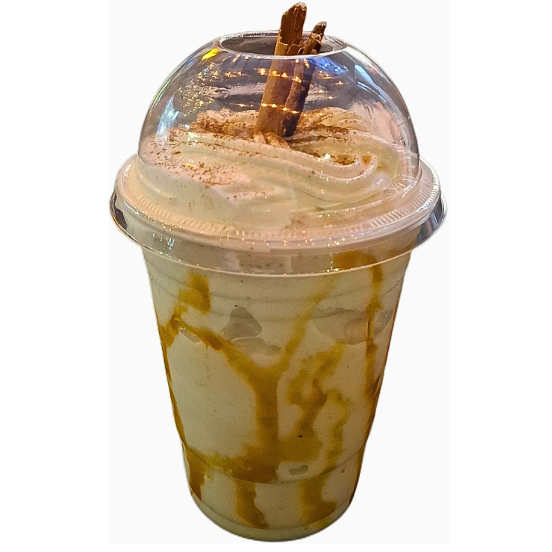 Frappé hecho con base de Arroz con Leche (arroz con leche casero), topping de crema batida con polvos de canela molida y una barita de canela.