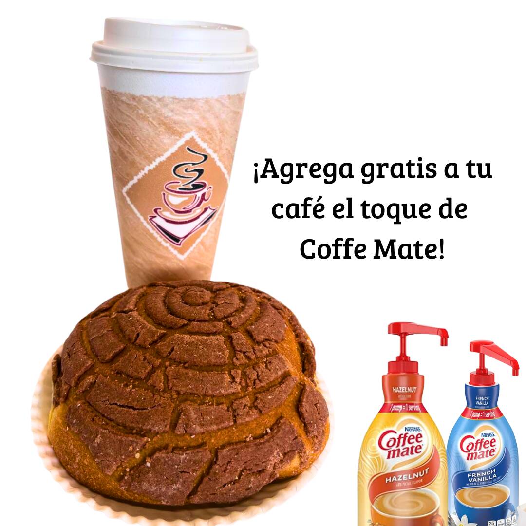 22oz de café de especialidad "Latitud" (tipo americano), recién molido, dale el toque cremoso el Coffe Mate que quieras (Hazelnut y Vainilla) con un pan a elegir (concha, cuernito o blanco)