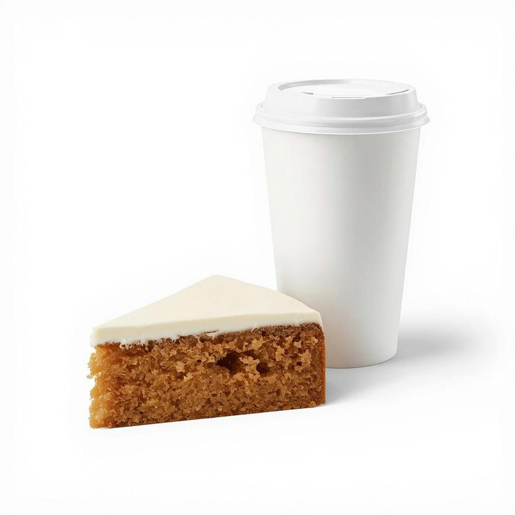 Café del día de 22oz (elaborado diariamente con nuestro café "Latitud", recién molido, extracción en cafetera, puedes agregar el toque cremoso de Coffe Mate sabor Hazelnut o Vainilla) y una rebanada de pastel de zanahoria, elaborado artesanalmente con mantequilla e ingredientes naturales de alta calidad.