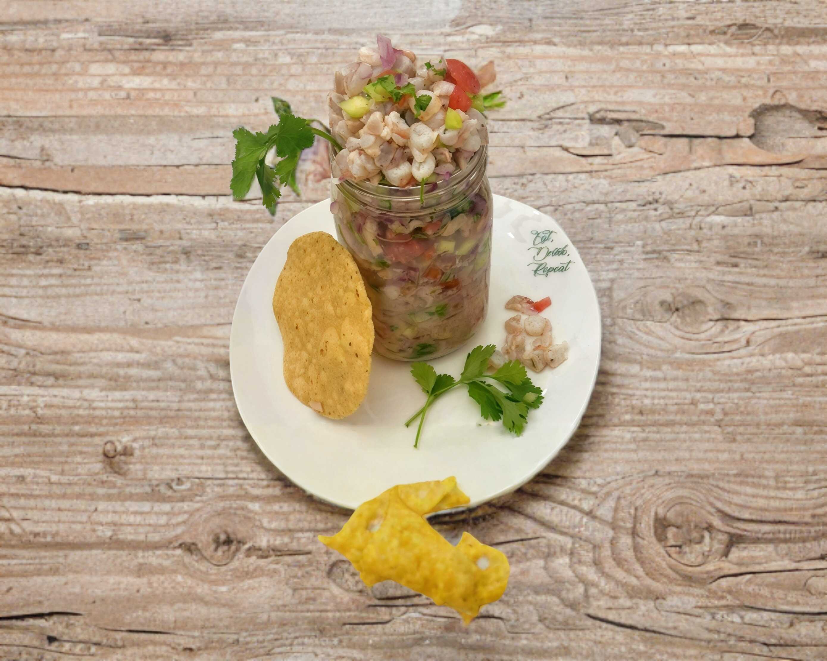 Camarón crudo curtido en limón, cebolla morada, tomate, cilantro, pepino y salsa de la casa.