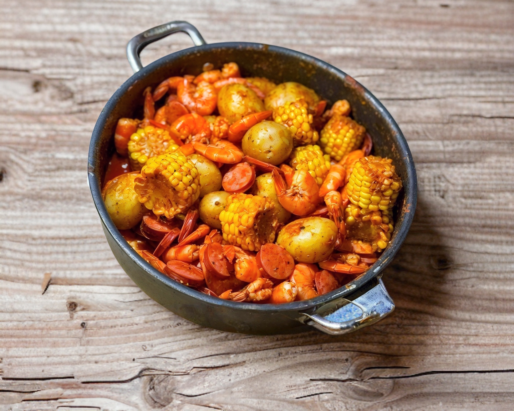 Camarones grandes con cascara estilo Louisiana, papa cambray, salchicha polaca, bañados en mantequilla y salsa de la casa.