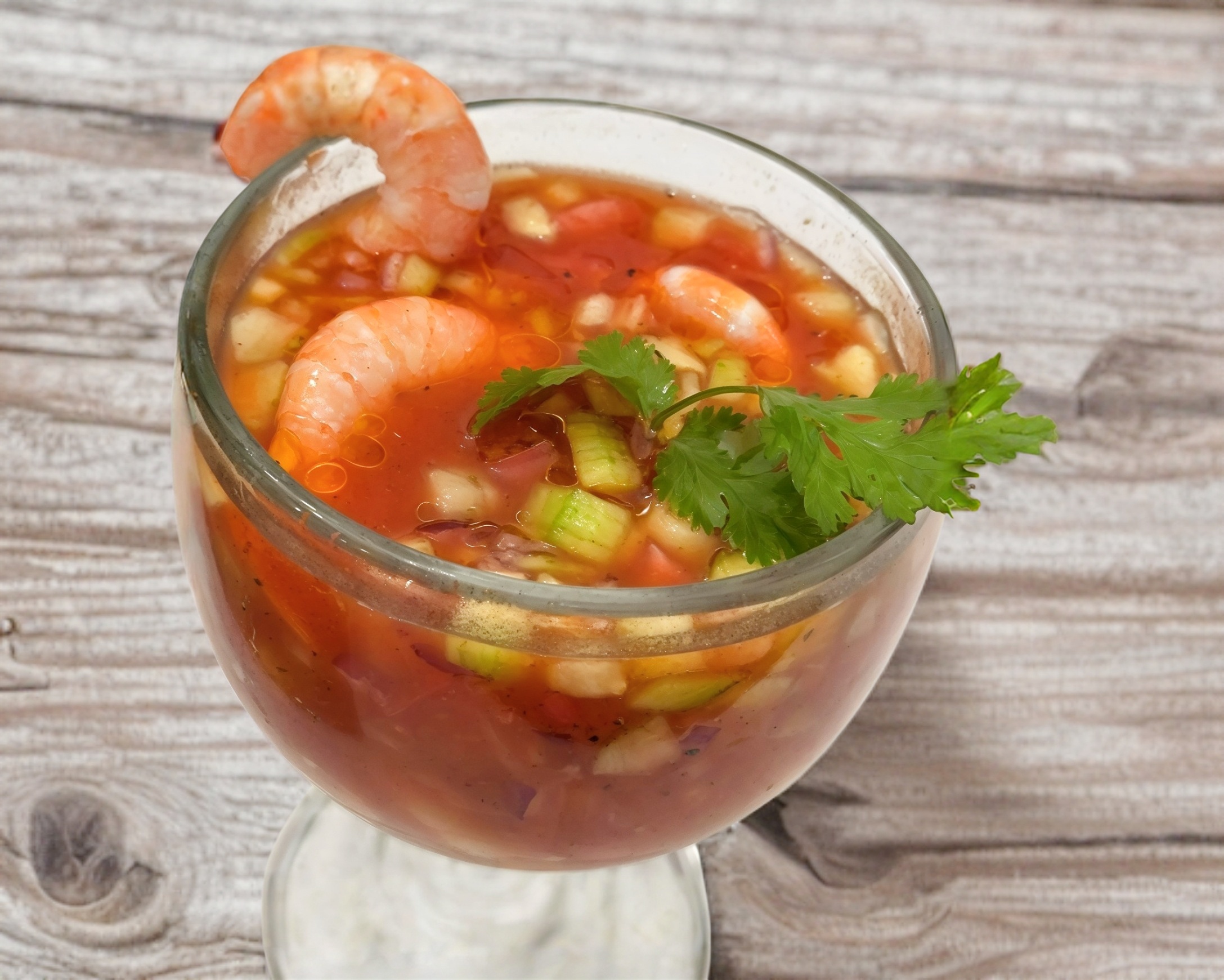 Coctel de camaron cocido con cebolla morada, poepino picado, tomate y cilanto ahogado en nuestra receta especfial de coctail estilo sinaloa. acompañado de galletas saladas.