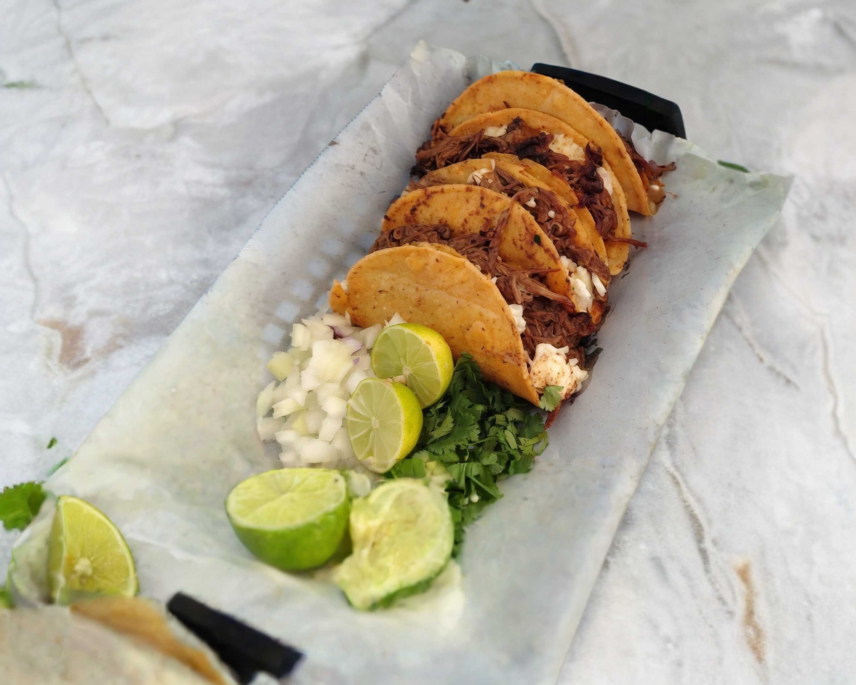 Cuatro tacos de birria, acompañados de un consomé, verduras y limón
