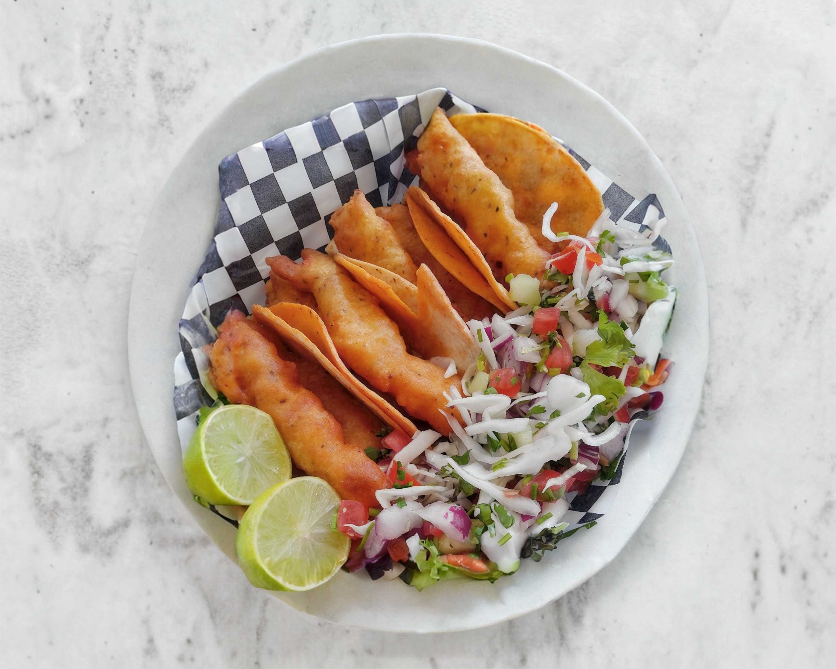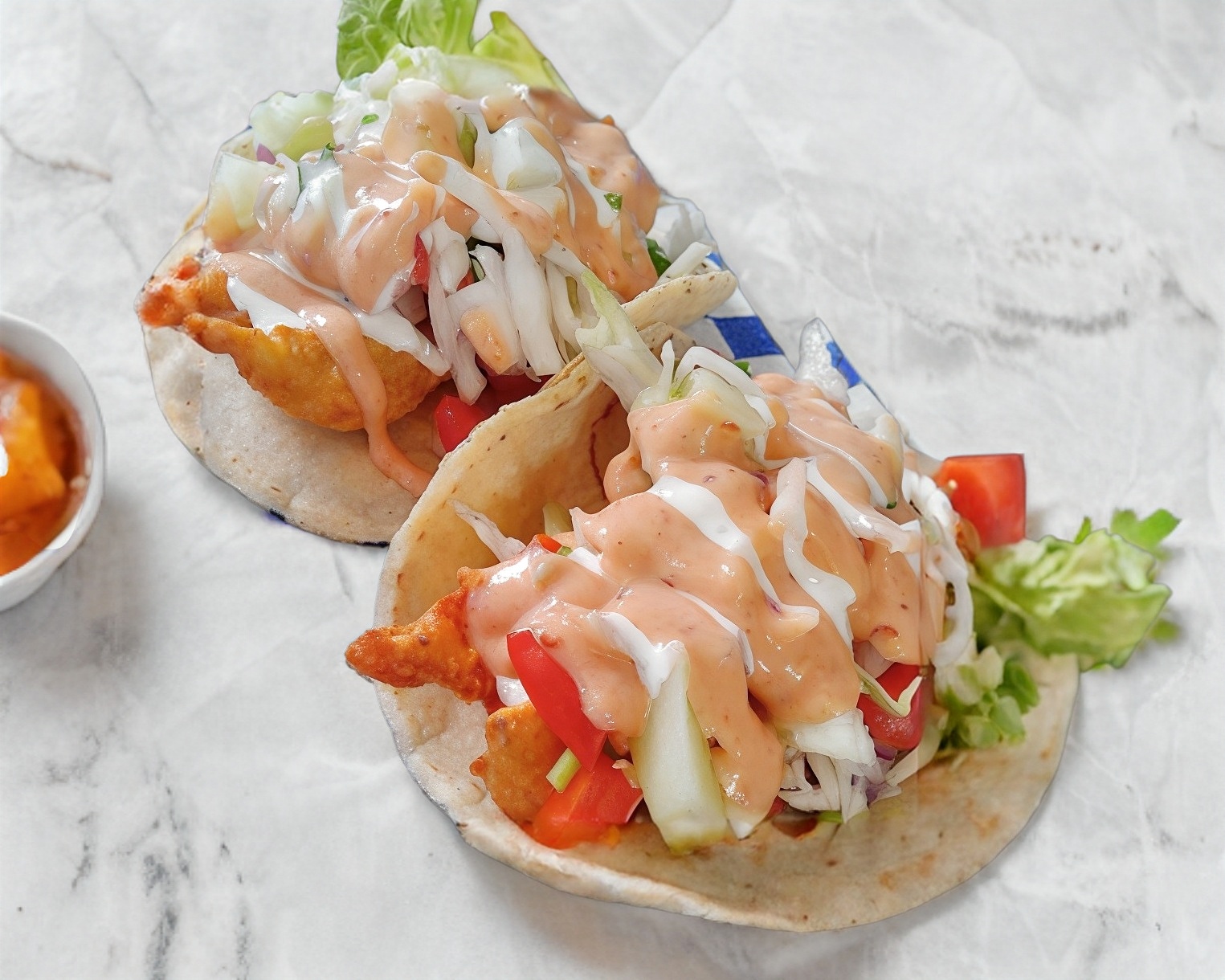 Un taco grande de camarones capeados, acompañados de salsa, verdura y limones.